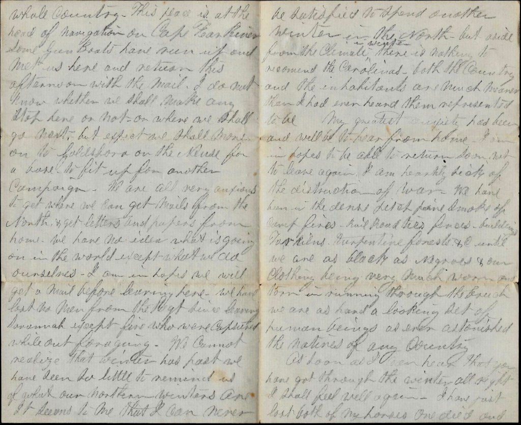 This place is at the head of navigation on Cape Fear River. Some gunboats have run up and met us here and returned this afternoon with the mail. I do not know whether we shall make any stop here or not, or where we shall go next, but expect we shall move on to Goldsboro on the Neuse for a base to fit up for another campaign. We are all very anxious to get where we can get mails from the North and get letters and papers from home. We have no idea what is going on in the world except what we do ourselves. I am in hopes we will get a mail before leaving here.