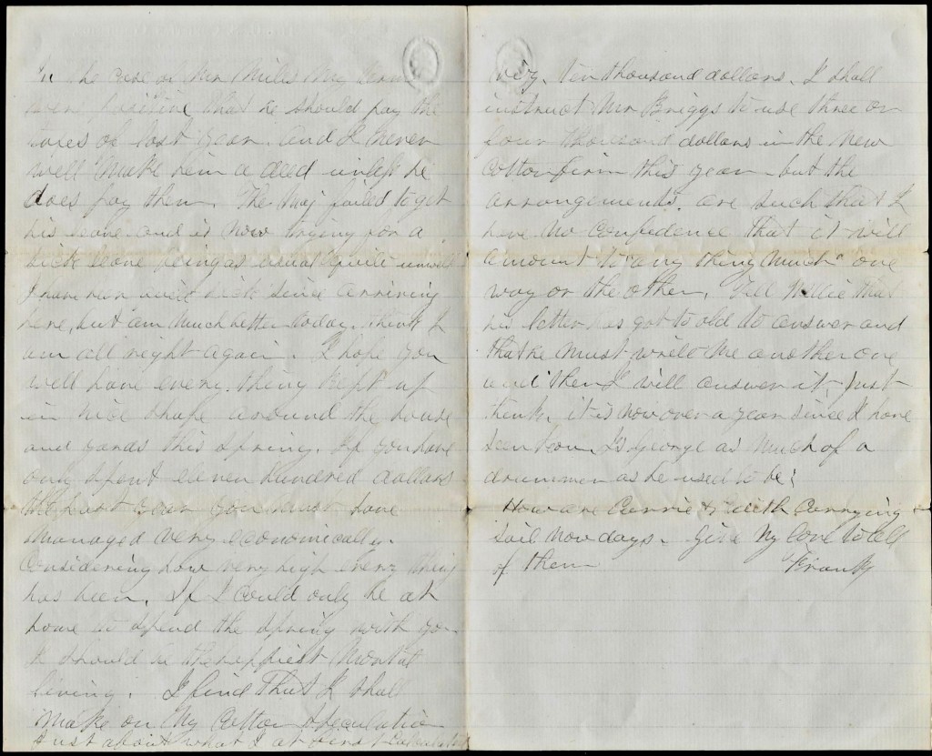 I am sorry that I shall not be able to help settle the matter up as Mr. Caldwell makes a great many blunders in his accounts, being a very poor accountant. I will send you a copy of his balance sheet to October 22nd, the time I left here, together with as plain a statement as possible of his maters stand so that you will be able to get home one to settle with him if necessary. Give my love to all the children and remember how devoted I remain. Your affectionate husband, — Frank