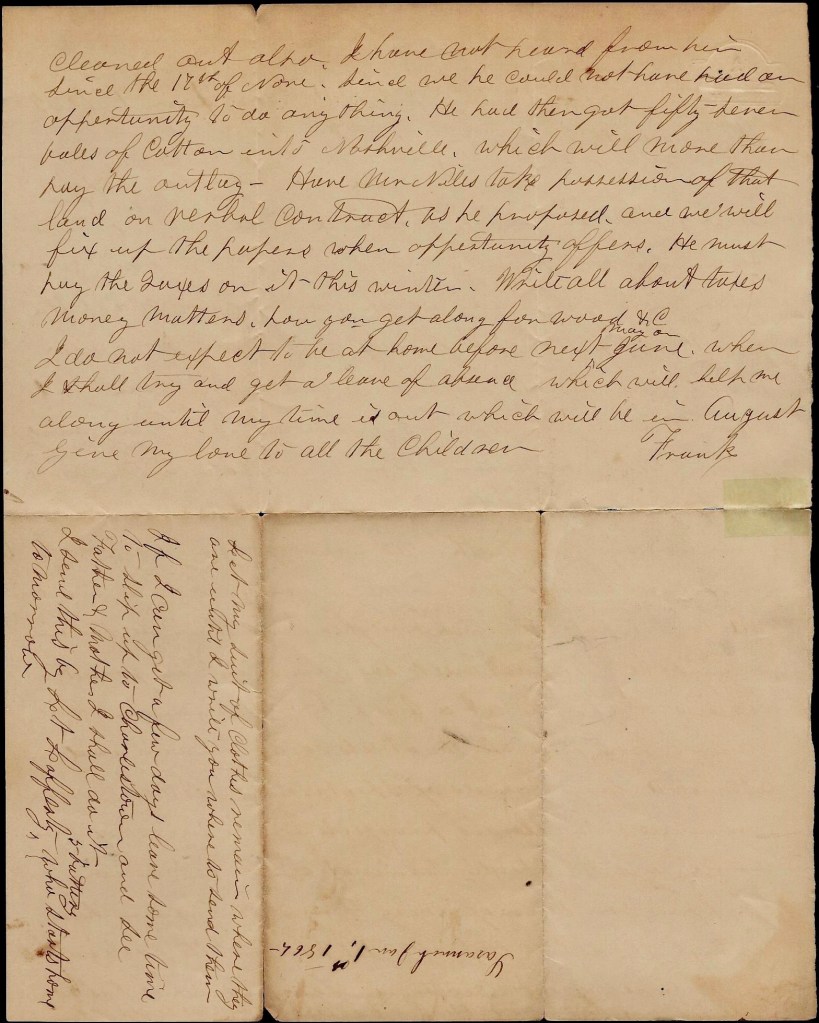 Have Mr. Niles take possession of that land on verbal contract as he proposed and we will fix up the papers when opportunity offers. He must pay the taxes on it this winter. Write all about taxes, money matters, how you get along for wood, &c. I do not expect to be at home before next May or June when I shall try and get a leave of absence which will help me along until my time is out which will be in August. Give my love to all the children. — Frank