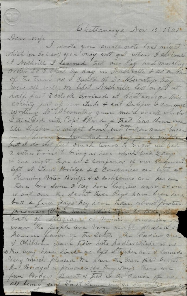 I wrote you a small note last night (on the cars) which you may not get. When I arrived at Nashville, I learned that our regiment had marching orders so I spent the day in Nashville & as much of the time as i could at Dr. Abernathy’s. They were all well. We left Nashville last night at half past 8 o’clock, arrived at Chattanooga this evening, put up our tents & eat supper & commenced writing. Mrs. Abernathy gave me a snack which I divided with Capt. [Elijah H.] Ikard and that has done me till supper tonight. Some of our men took on raw bacon in a hurry. We have had no sleep for two nights but I do not feel much tired tonight.