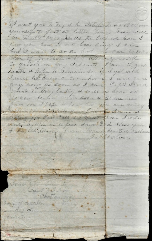 I want you to try to be satisfied and not allow yourself to fret at little things. There will be trouble enough. Do the best we can. I know you cannot bear the things I can, but I want you to do the best you can to take care of yourself and not allow yourself to grieve on my account. I am in good health and hope to remain so. If I get sick, I will let you know or come home. I will come anyhow as soon as I can. Capt. Ikard want to come very badly & will as soon as he can leave. Write soon and let me hear from you. I hope to hear that you are doing well and reconciled to your fate.