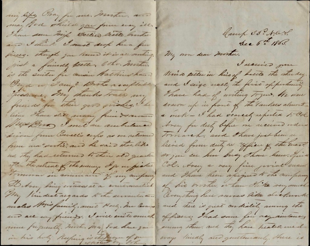 I met an ambulance driven from Ewell’s Corps as we returned from our sortie and he said that like us, they had returned to their old quarters after the retreat of the enemy. I go on picket tomorrow in command of my company, Lt. [Willoughby F.] Avery being witness as a court martial. My kindest regards to the servants and Uncle William’s family, Aunt Holly, Mr. Evans, and all my friends. I will write much more frequently this winter. My God have you in his holy keeping is the prayer of your affectionate boy, — John