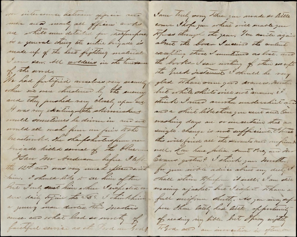 I trust this will find you all the servants and our friends well. How have Julia, Aunt Polly, and Mr. Evans gotten [along]? I thank you, mother, for your noble advice about my duty. I shall strive to perform it well. I am still wearing a jacket but I expect to have a full uniform shortly. As you may suppose, I have lately had little opportunity of reading my bible but I pray nightly to God and an invocation is often on my lips. Pray for me, mother, and may God shield you from every ill.