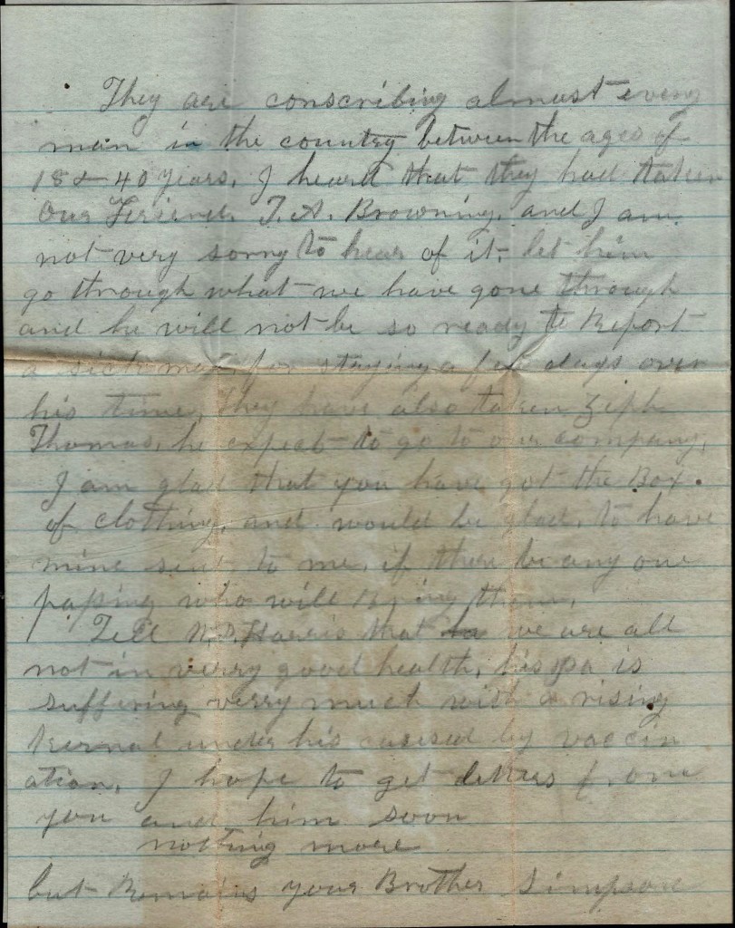 Tell W. D. Harris that we are all not in very good health. His pa is suffering very much with a rising kernal under his [c____ed] by vaccination. I hope to get letters from you and him soon. Nothing more but remain your brother, — Simpson