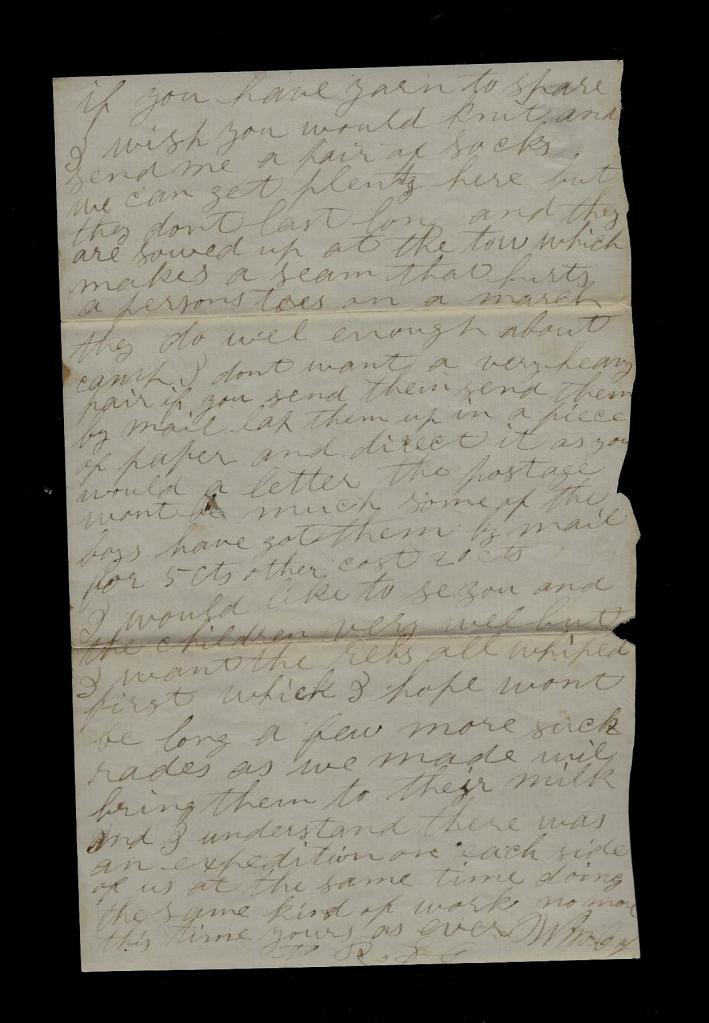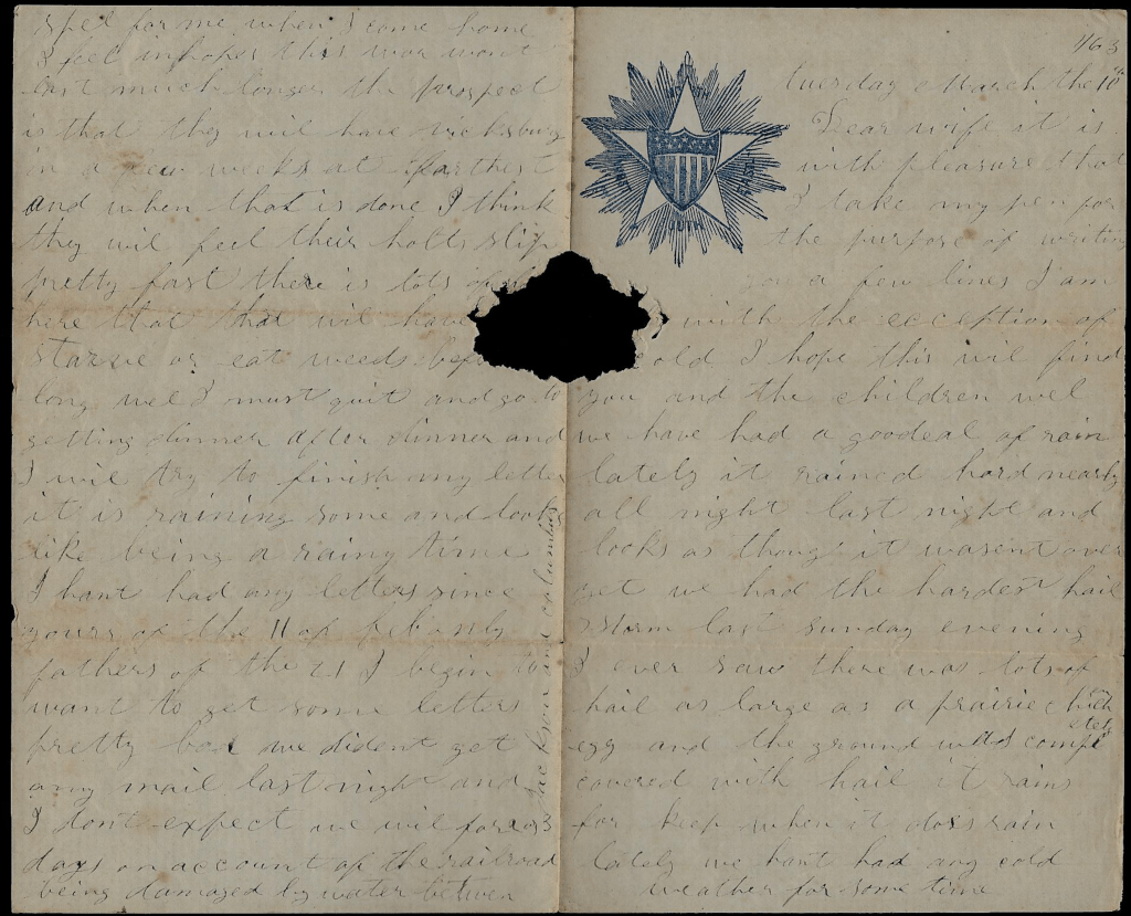 I now take my pen to write you a few lines in answer to yours of the 1st which I have just read. I am well as common and I hope when this reaches you it will find you and the children well. Tell them Copperheads when they are calling us all thieves that we are proud of the name in the place of being called Copperheads. We are working to put down the rebellion and if taking their property will weaken them, I say go in on it. I have never done anything yet that I am ashamed of. I have took in a few hogs and sheep and once in awhile a chicken, and I wouldn’t think I was a loyal man if I didn’t do all I could to starve them out.