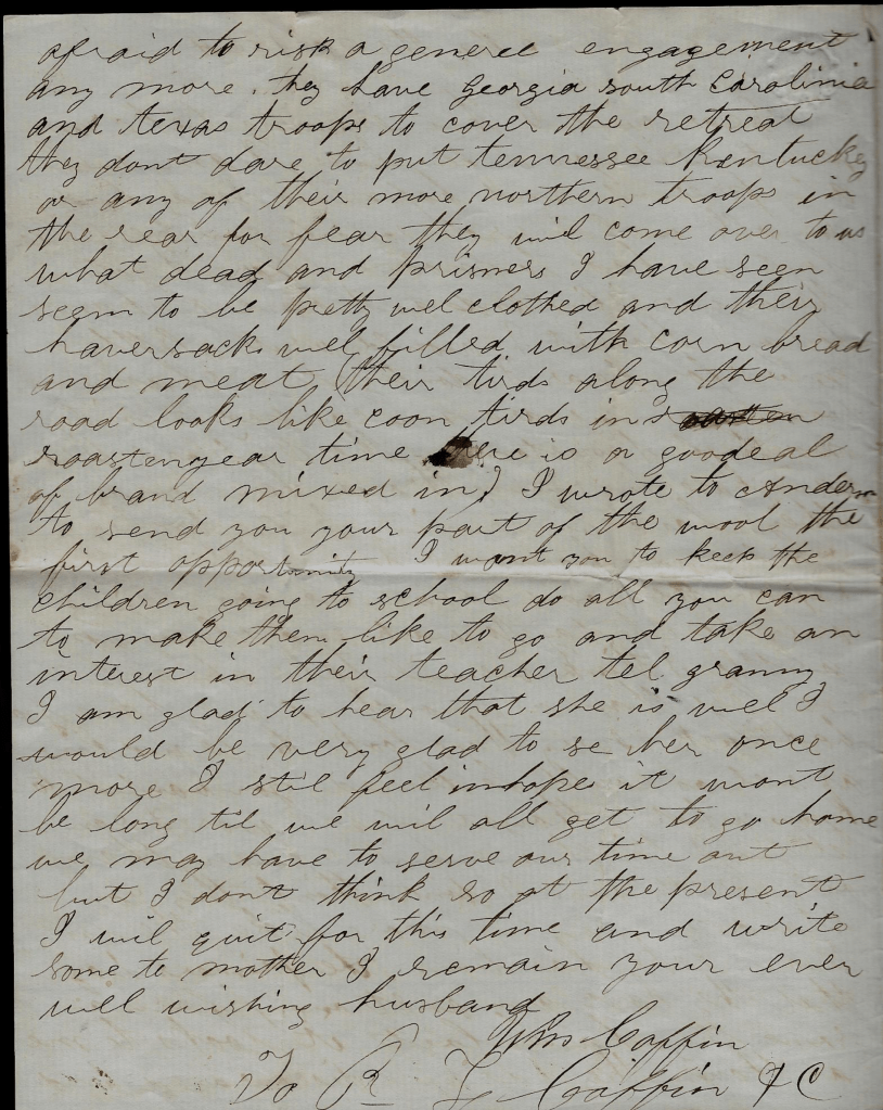 I wrote to Anderson to send you your part of the wool the first opportunity. I want you to keep the children going to school. D all you can on interest in their teacher. Tell granny I am glad to hear that she is well. I would be very glad to see her once more. I still feel in hope it won’t be long till we all get to go home. We may have to serve our time out but I don’t think so at the present. I will quit for this time and write some to mother. I remain your ever well wishing husband, — Wm. Coffin
