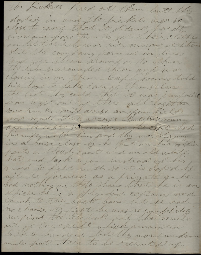 It is a little cooler today than it has been for a few days. There was two of the Kansas 7th [Regiment] shot yesterday while gathering berries about two miles from camp and this morning just at daylight Co. H was attacked where they were stationed 3 miles east of here guarding the mule corral. There was about 550 of the rebs and they had them completely surrounded before they knew they were there. The pickets fired at them but they dashed in and the pickets was so close to camp that it didn’t hardly give our boys time to get their clothes on till the rebs was right among them. Still the company formed in lines and give them a round or two when the rebs surrounded them and was closing i non them. Capt. Loomis told his boys to take care of themselves the best they could—that it was impossible to get out of there all together. Some ran half a mile across an open field and made their escape but 27 men and the captain surrendered. The captain had his wife with him and they was staying in a house close by. He put on his soldier pants, a bluish coat and an old white hat and took a gun instead of his sword to fight with so it is hoped he will be paroled as a private as he had nothing on to show that he is an officer. He is a splendid captain and spunk to the backbone but he had no chance to fight—he was so completely surprised. The rebs took all the miles out of the corral which amounted to three or four hundred but they was run down mules, put there to be recruited up.