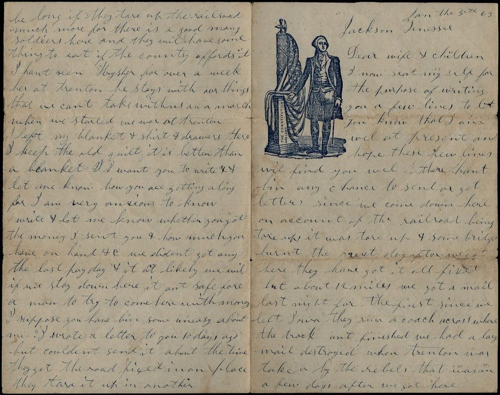 I now seat myself for the purpose of writing you a few lines to let you know that I am well at present and hope these few lines will find you well. There han’t been any chance to send or get letters since we come down here on account of the railroad being tore up It was tore up & some bridge burnt the next day after we got here. They have got it all fixed but about 12 miles. We got a mail last night for the first time since we left Iowa. They run a coach across where the track ain’t finished. We had a large mail destroyed when Trenton was taken by the rebels. That was in a few days after we got here.