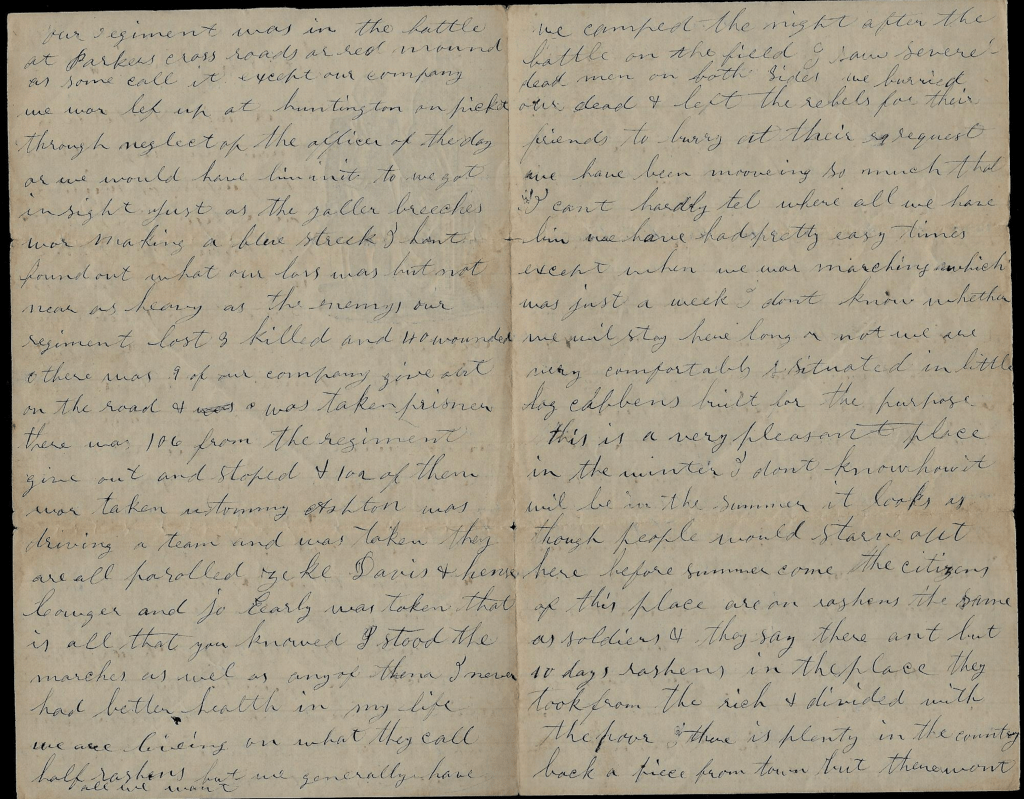 Our regiment was in the battle of Parker’s Cross Roads or Red Mound as some call it, except our company was left up at Huntington on picket through neglect of the officer of the day or we would have been in it too. We got in sight just as the yaller breeches was making a blue streak. I han’t found out what our loss was but not near as heavy as the enemy. Our regiment lost 3 killed and 40 wounded & there was 9 of our company give out on the road & was taken prisoner. There was 106 from the regiment give out and stopped & 102 of them was taken.
