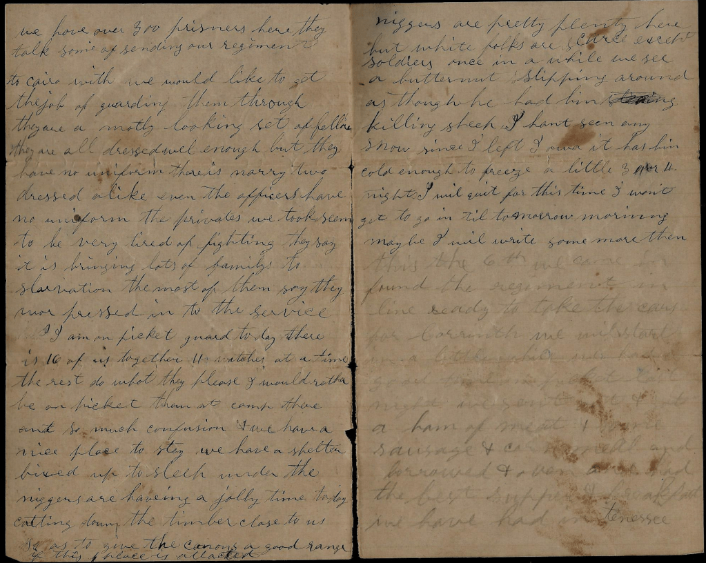 This the 6th [January]. We came in and found the regiment in line ready to take the cars for Corinth. We will start in a little while. We had a good time on picket last night. We sent out & got a ham of meat & some sausage & corn meal and borrowed an oven and had the best supper & breakfast we have had in Tennessee. I will have to quit for this time.