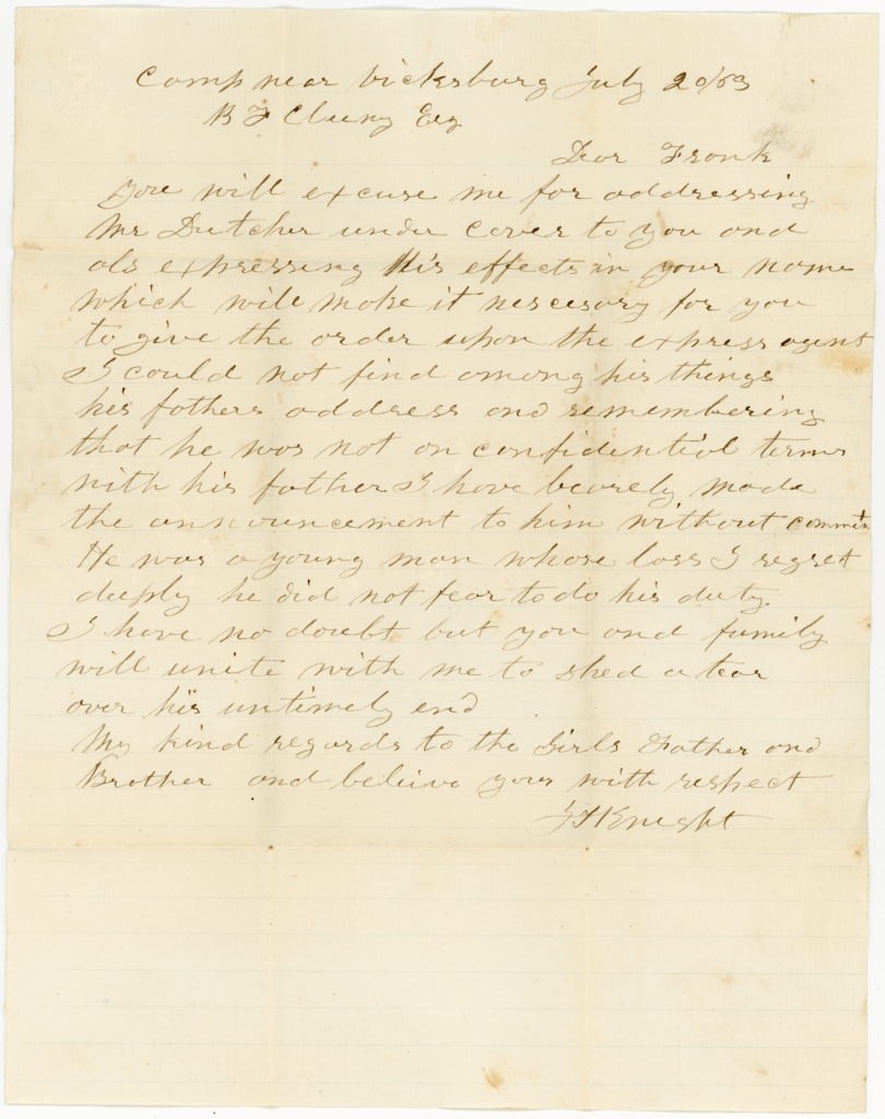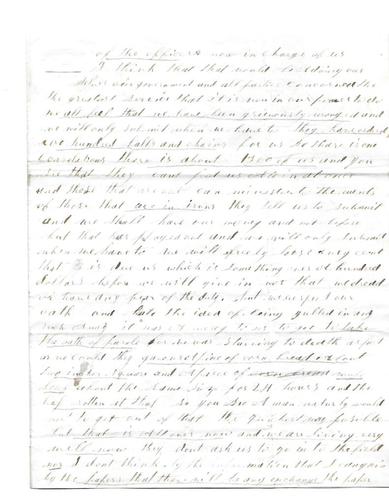 Tell Mother that I have taken the liberty of giving the needle case she intended for Will to Conrad Madison, my fellow prisoner in Florence [South Carolina]. 1 I took out the Testament and if I see Will, he shall have it. My reasons for giving to Madison were that I think it will be a great while before I shall see Will and if I do, he can have the free use of mine. And as I was at headquarters and was going to leave Madison, I wished to present him something, which I did, and he sends his thanks to her.
