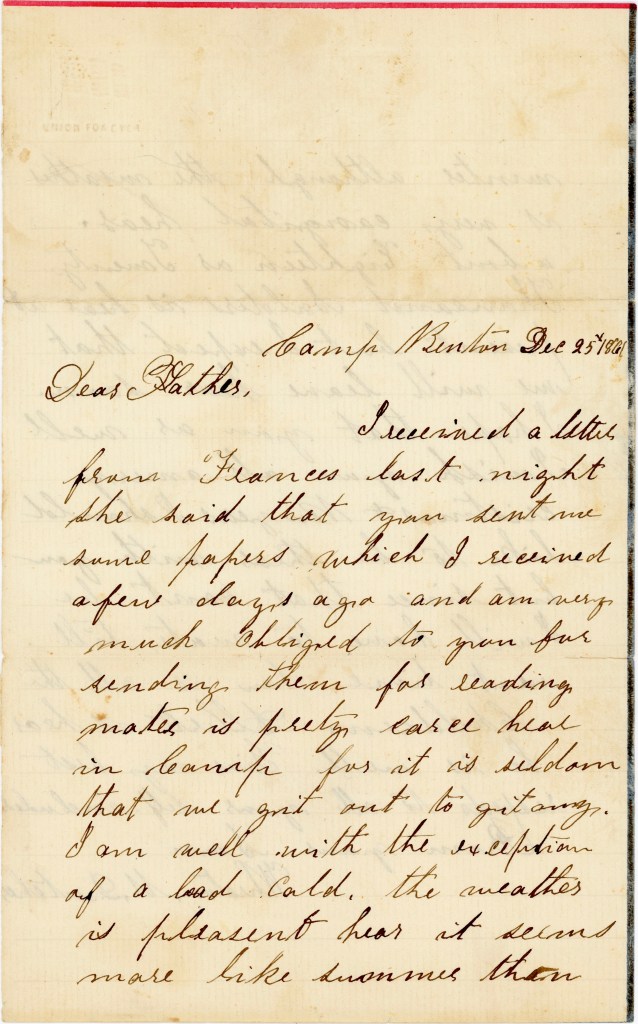 My eyes feel more like peeled onions that anything else but they are getting better. Have you any snow yet? Tell Father that I have Expressed a box to McGregor to him with two overcoats and a pair of pants. The large overcoat is for Emerson and the pants and the other coat, which is mine, is for Father. Clothing has raised and the boys do not wish to sell while it is so high. I will enclose a note in this which you will hand to Emerson and when you write, send me his P. O. address as I have forgotten it. Tell Father that he have mine for eight (8) dollars and if he concludes to take it, to send the money as there is no prospect of my getting any pay for some time yet.