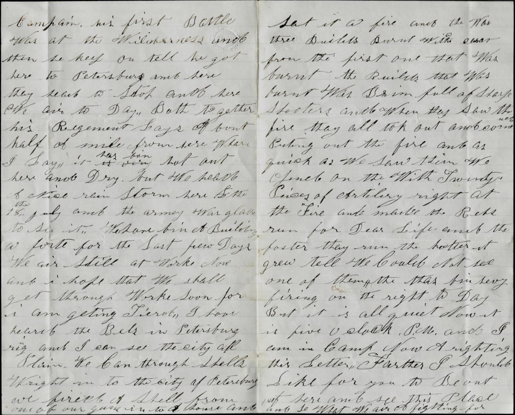 We have been a building a fort for the last few days. We are still at work now and I hope that we shall get through work soon for I am getting tired. I have heard the bells in Petersburg ring and I can see the city all plain. We can throw shells right into the city of Petersburg. we fired a shell from one of our guns into a house and set it on fire and there was three buildings burnt [that caught fire] from the first one that was burnt. The building that was burnt was brim full of sharpshooters and when they saw the fire, they all took out and commenced putting out the fire and as quick as we saw them, we opened on them with twenty pieces of artillery right at the fire and made the rebels run for dear life. And the faster they run, the hotter it grew till we could not see one of them. 1