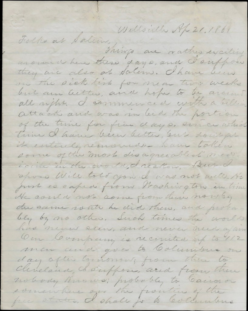As I wrote you before, the secessionists have gone on ahead of us. We now hear of them 30 miles from here. There are but few secessionists around where we have been. All along the road we have met with enthusiastic receptions, and the people wish us God speed.