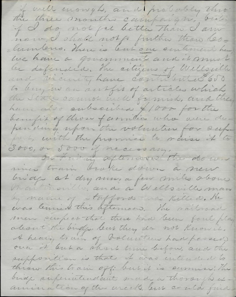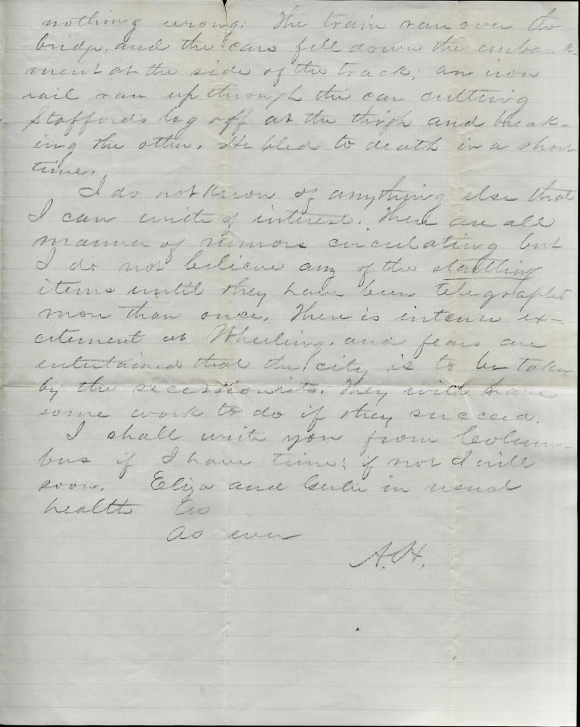 We have no idea where we are going to but our course thus far has been almost southeast. Get a large map of Virginia and find Barbour county & you will find where we are now. Give my love to all my friends and tell them that I have not time to write to them & attend to my Boys here, and they require my attention first. Address me at Clarksburg, Virginia, Co. K, 2rd Regt. Ohio Volunteers.”