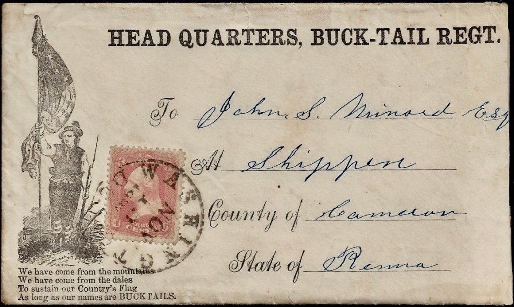 This letter was written by Seneca Freeman Minard (1837-1914) of Shippen, Cameron county, Pennsylvania, who mustered into the Kane Rifle Regiment of the Pennsylvania Reserve Corps (13th Pennsylvania Reserves, 42nd Pennsylvania Infantry)—better known as the “Bucktail Regiment”—on 1 June 1861 as a private in Co. C. At the time of his enrollment he was described as standing 5′ 9.5″ tall, with black hair, and blue eyes. He gave his occupation just prior to his enlistment as “lumberman.”