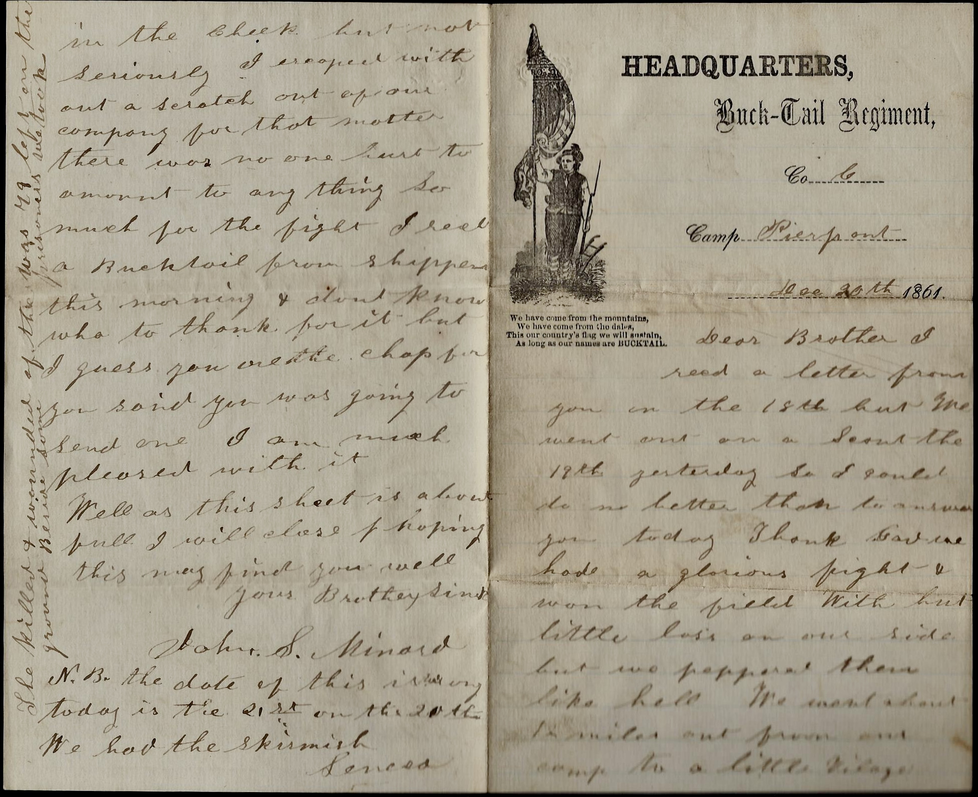 The letter was datelined from Camp Butterfield on Christmas day, 1861—just five days after the Battle of Dranesville—a skirmish really—in which both sides suffered relatively low casualties. The Union infantry regiments engaged in the fight included the 9th, 12th and 13th Pennsylvania Reserves (the latter being designated the 42nd Pennsylvania, the 1st Pennsylvania Rifles, or more popularly referred to as “Kane’s Bucktails”). Julian’s younger brother, Byron (“By”) D. Knowlton (1842-1923) was a member of Co. D in the Bucktails but we learn from Julian’s letter that By was not in the battle. Rather, he was on guard duty at their camp on the day of the battle.13th Pennsylvania Reserves, Officially designated the 42nd Pennsylvania Volunteer Infantry, the unit was also known as the 13th Pennsylvania Reserves, the 1st Pennsylvania Rifles, and the Kane Rifles.