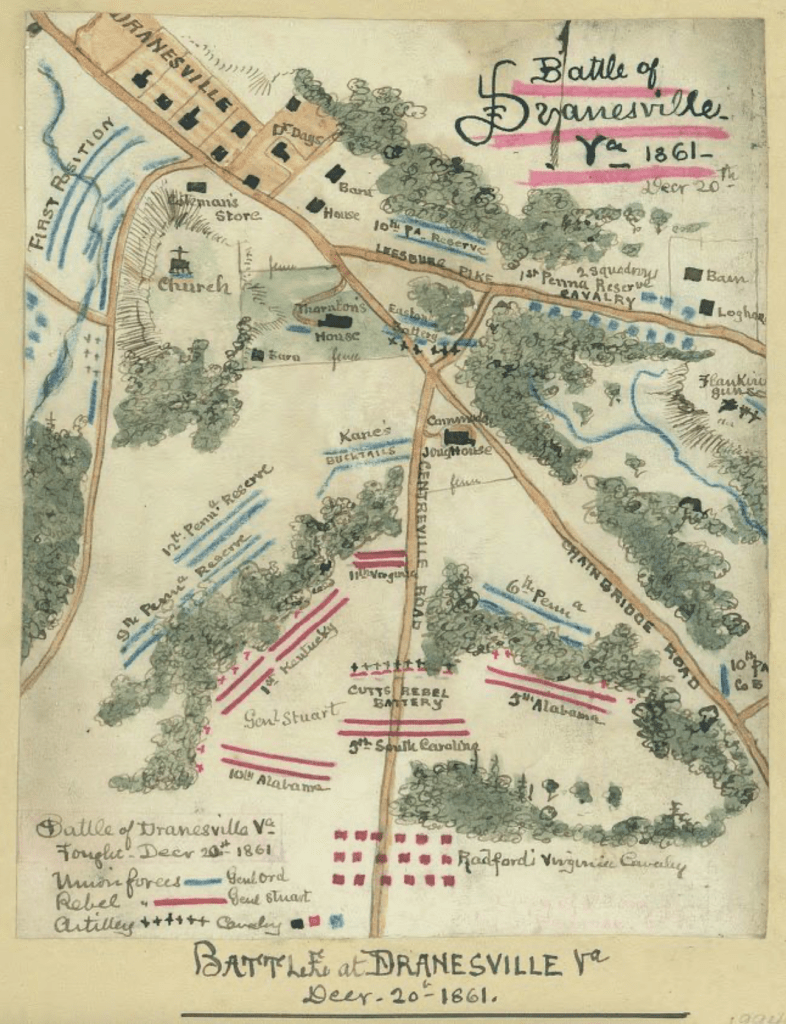 Julian’s letter asserts that the Bucktails faced the Louisiana Tigers at Dranesville but he was mistaken. The Confederate forces consisted of Kentucky, Virginia, Alabama, and South Carolina troops under the command of General Stuart.