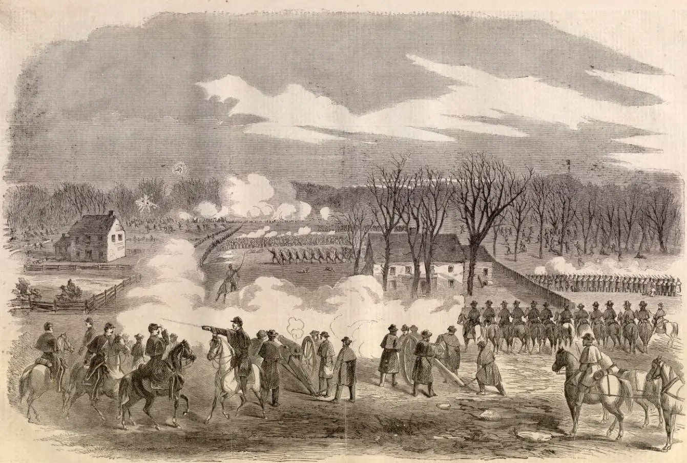 I read a letter from you on the 18th but we went out on a scout the 19th yesterday so I could do no better than to answer you today, thank God. We had a glorious fight & won the field with but little loss on our side but we peppered them like hell. We went about two miles out from our camp [on the Leesburg pike] to a little village called Dranesville. After scouting around there for about an hour we run into a nest of them stationed in a thick grove of little pines. They had four pieces of artillery and about four or five thousand footmen as near as we could find out.