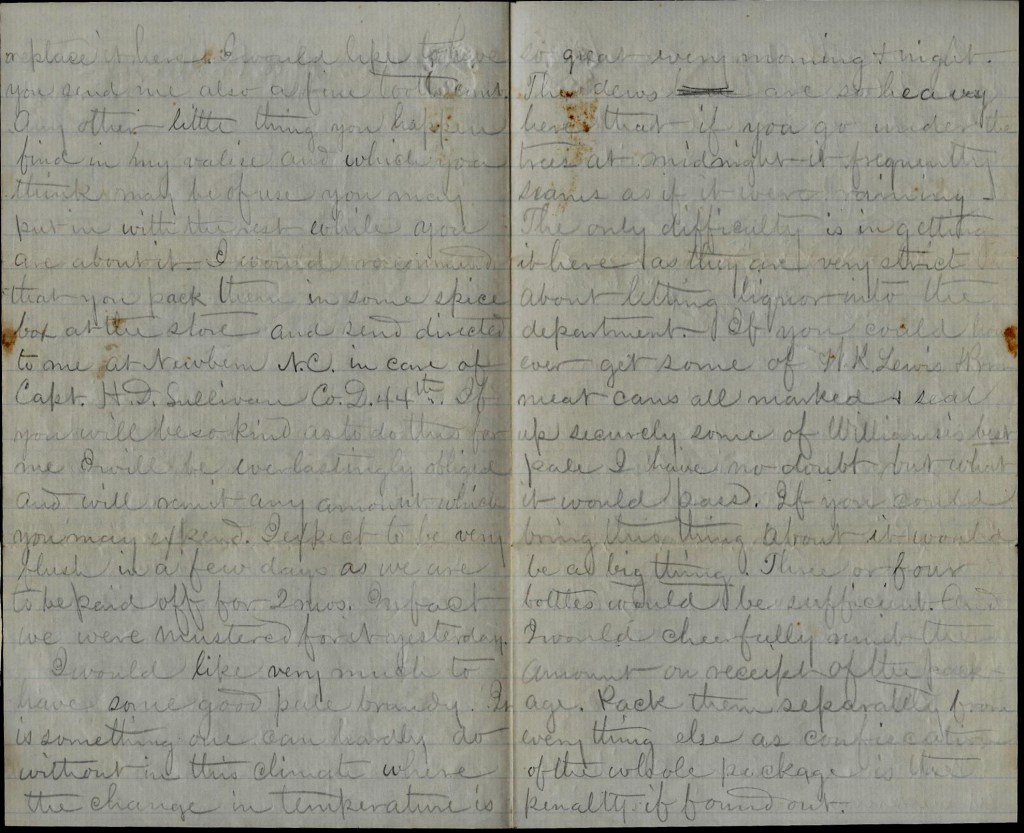 How do you all do at home? There has been four boxes brought here, some came with poultry and mince pies and were all moulded. There was another without the poultry and was perfectly good. A box I should like very much but there is some risk so will leave it all with you. I don’t know as I shall want any clothing except stockings and a pair of slippers. I do not expect one, but if you do, I should like to have you see or write to David, 98 Court Street and ask him to ask Miss Stetson for some tracts. She can get them for nothing for soldiers. Some apples too.