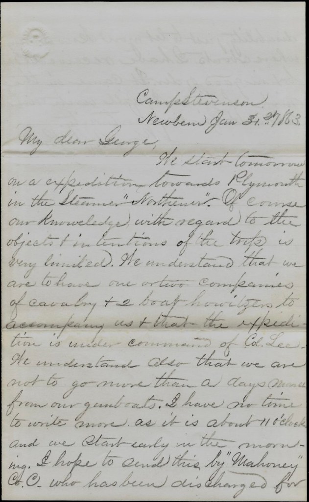 Although not hearing from you since I wrote, I thought you would like to hear from me. We have just arrived at Newbern again after being absent two weeks on an expedition. We first took the steamer and went to Washington, N C. Then went on foot I should think from one hundred to one hundred and fifty miles. I had a much walking as I wished.