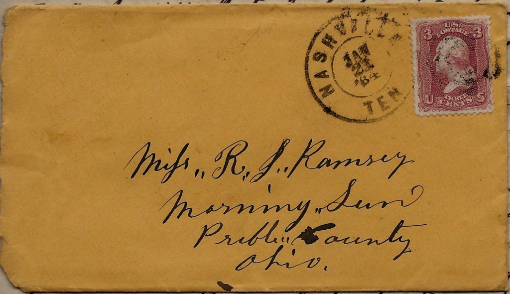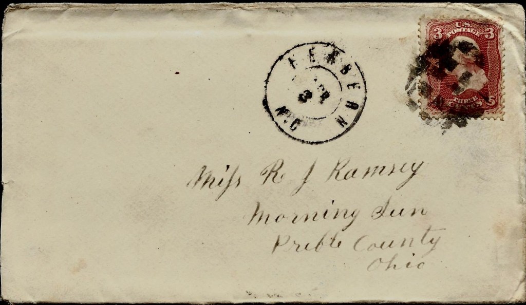 Addressed to Miss R. J. Ramsey, Morning Sun, Preble county, Ohio