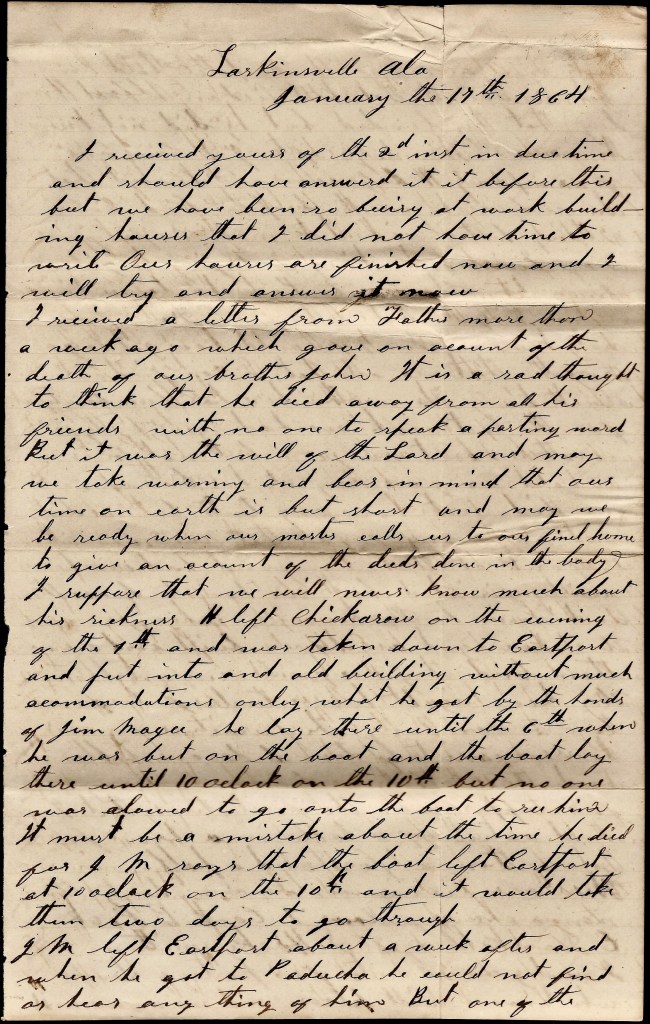 I received a letter from Father more than a week ago which gave an account of the death of our brother John. It is a sad thought to think that he died away from all his friends with no one to speak a parting word. But it was the will of the Lord and may we take warning and bear in mind that our time on earth is but short and may we be ready when our Master calls us to our final home to give an account of the deeds done in the body. I suppose we will never know much about his sickness. He left Chickasaw on the evening of the 4th and was taken down to Eastport and put into an old building without much accommodations—only what he got by the hands of [Sgt.] Jim Magee. He lay there until the 6th when he was put on the boat and the boat lay there until 10 o’clock on the 10th but no one was allowed to go onto the boat to see him. It must be a mistake about the time he died for J. M. says that the boat left Eastport at 10 o’clock on the 10th and it would take them two days to go through.