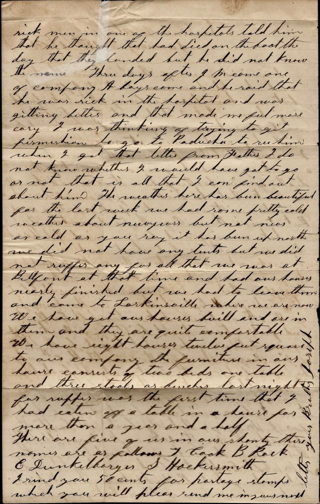There are five of us in our shanty. Their names are as follows: J[ohn] Cook, [Andrew] B. Rock, E[lias] Dunkelberger, S[amuel] Hockersmith. I send you 50 cents for postage stamps which you will please send me in your next letter.