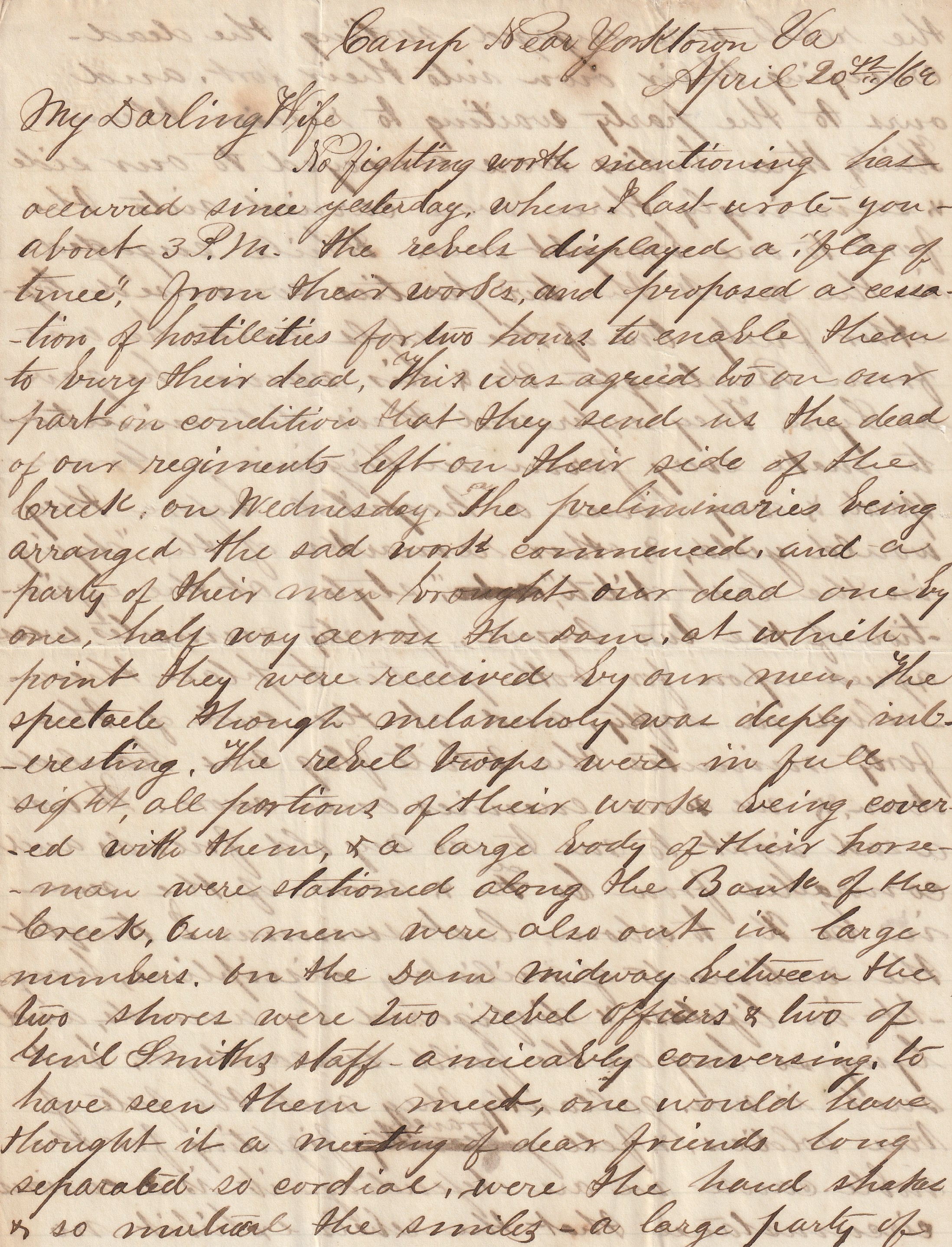 No fighting worth mentioning has occurred since yesterday when I last wrote you. About 3 p.m., the rebels displayed a “flag of truce” from their works, and proposed a cessation of hostilities for two hours to enable them to bury their dead. This was agreed to on our part on condition that they send us the dead of our regiments left on their side of the creek on Wednesday. The preliminaries being arranged, the sad work commenced and a party of their men brought our dead, one by one, half-way across the dam at which point they were received by our men. The spectacle—though melancholy—was deeply interesting. The rebel troops were in full sight, all portions of their works being covered with them, and a large body of their horsemen were stationed along the bank of the creek. Our men were also out in large numbers. On the dam midway between the two shores were two rebel officers and two of Gen. Smith’s staff amiably conversing. To have seen them meet, one would have thought it a meeting of dear friends long separated so cordial were the handshakes & so mutual the smiles.