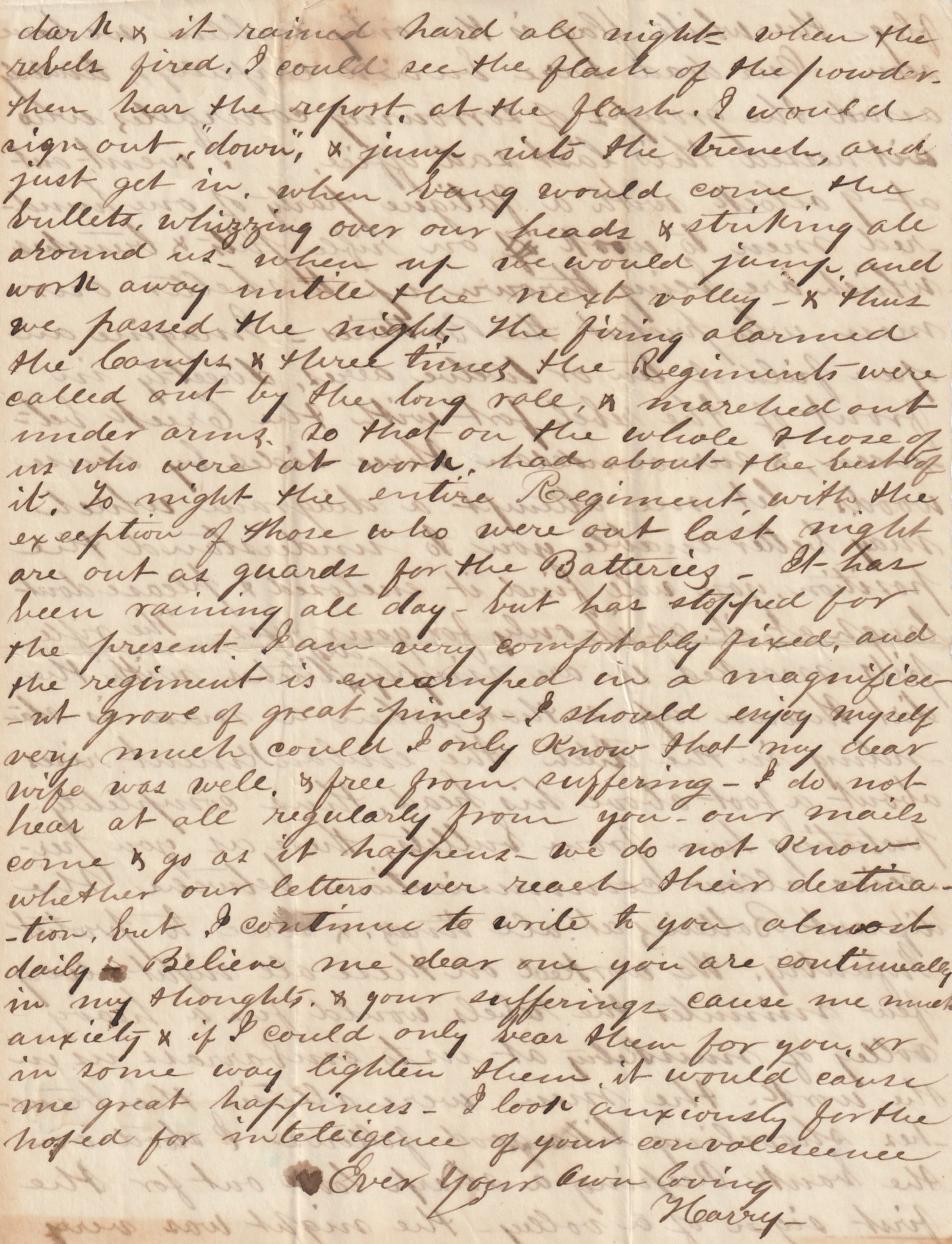 The firing alarmed the camps and three times the regiments were called out by the long roll and marched out under arms so that on the whole, those of us who were at work had about the best of it. Tonight the entire regiment with the exception of those who were out last night are out as guards for the batteries. It has been raining all day but has stopped for the present.