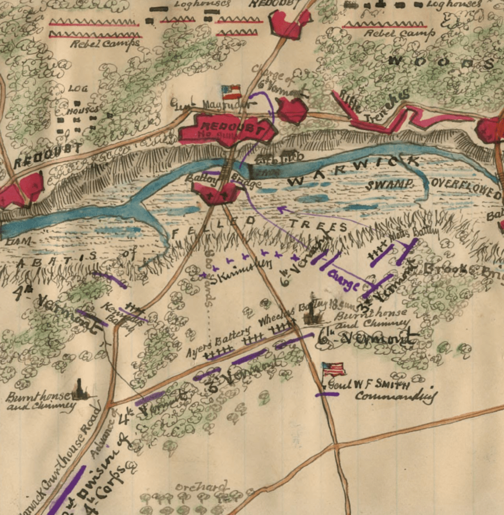 Map showing the placement and lines of attack by the Vermont Brigade on 16 April 1862