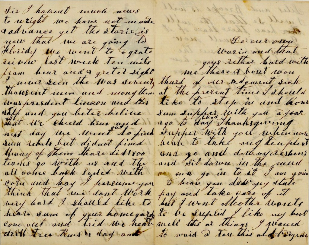 Sir, I haven’t much news to write. We have not made an advance yet. The story is now that we are going to Florida. We went to a Great Review last week ten miles from here and a greater sight I never seen. There was seventy thousand men and among them was President Lincoln and his staff and you better believe that we cheered him and next day we went out to find some rebels but didn’t find many of them. There did 100 teams go with us and they all came back loaded with corn and hay.