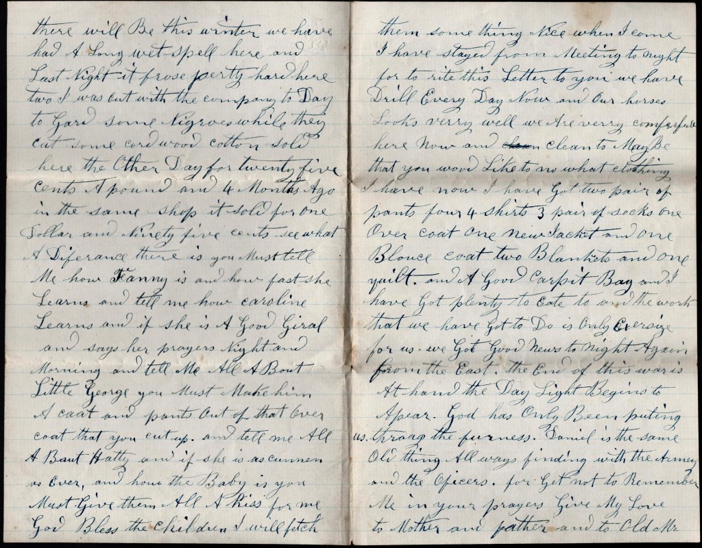 We have got a good deal of picket duty to do just now. We are dressed very well & I got another over coat and it is a good one. I have two other coats, two pair of pants, 3 pair of socks, 3 shirts, 2 pair of drawers, one pair of boots, two blankets.