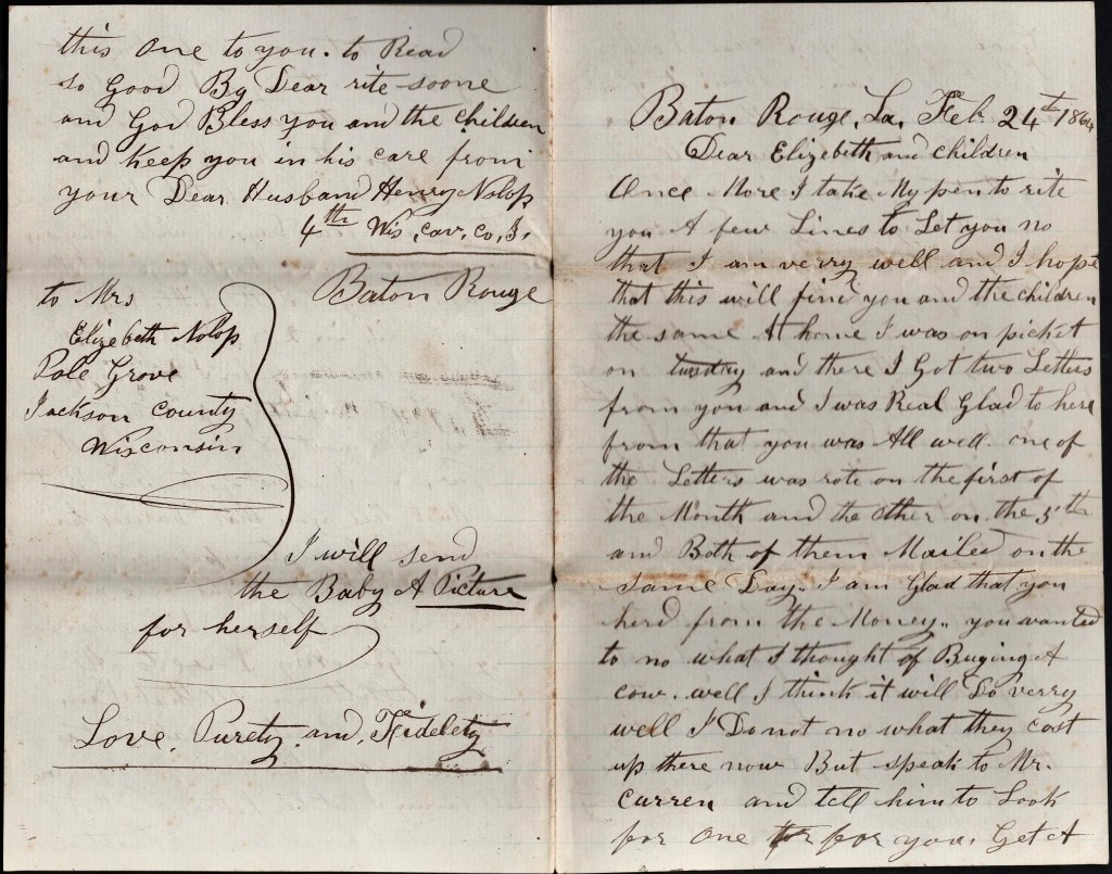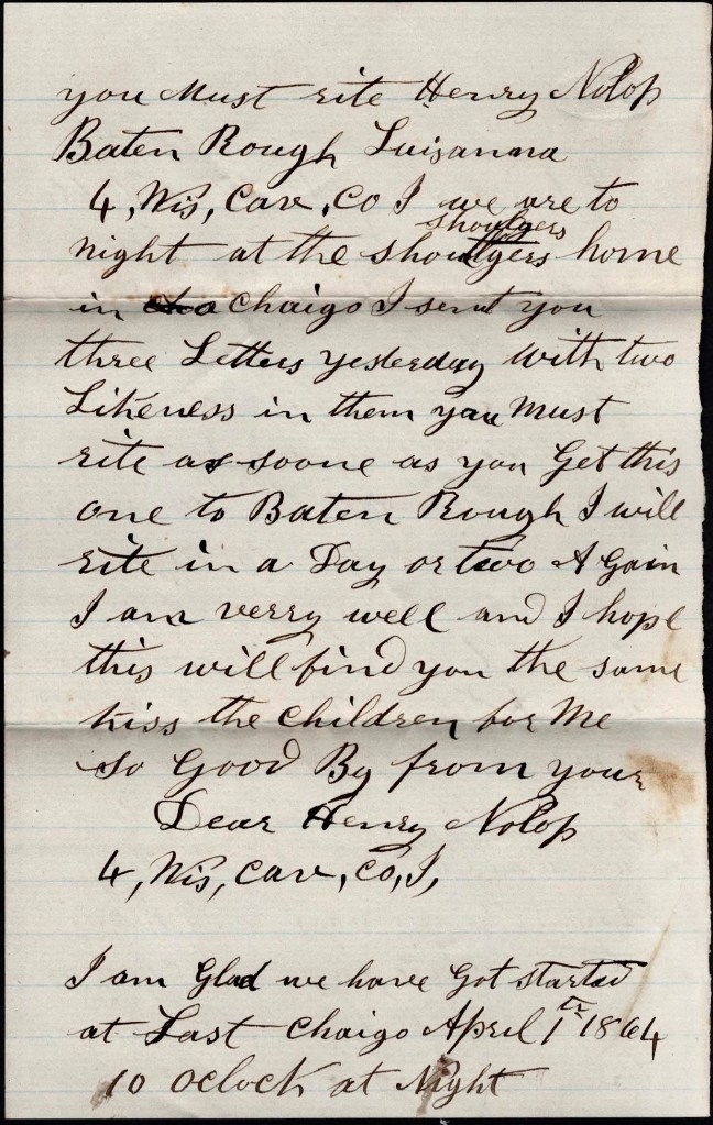 You must write, Henry Nolop, Baton Rouge, Louisiana, 4th Wisconsin Cavalry, Co. I. We are tonight at the Soldier’s Home in Chicago. I sent you three letters yesterday with two likenesses in them. You must write as soon as you get this to Baton Rouge. I will write in a day or two again. I am very well and I hope this will find you the same. Kiss the children for me. So goodbye from your dear [husband], — Henry Nolop, 4th Wis. Cav. Co. I