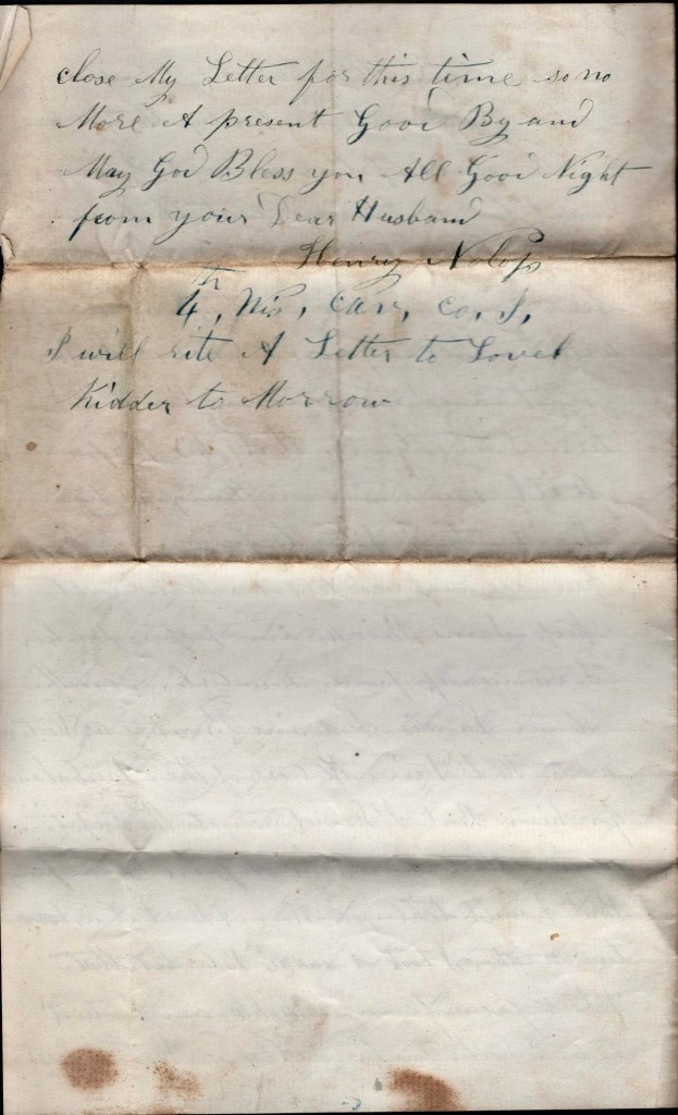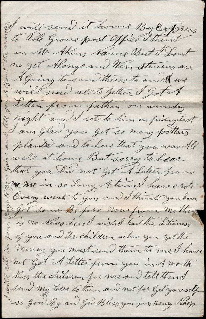 Today I will send two little books home to you. The colonel is gone to New Orleans for our boxes with our clothes. I have got plenty of clothing. Give my love to all inquiring friends. Tell them that I think that I will shortly be with them. Give my love to Cate. Tell if you hear anything of Oliver. Don’t forget to remember me to Old Mr. and Mts. Mortiboy. Kiss the children for me and God bless them and keep them in his care. So goodbye for this time and God bless you in the prayer of your loving husband, — Henry Nolop.