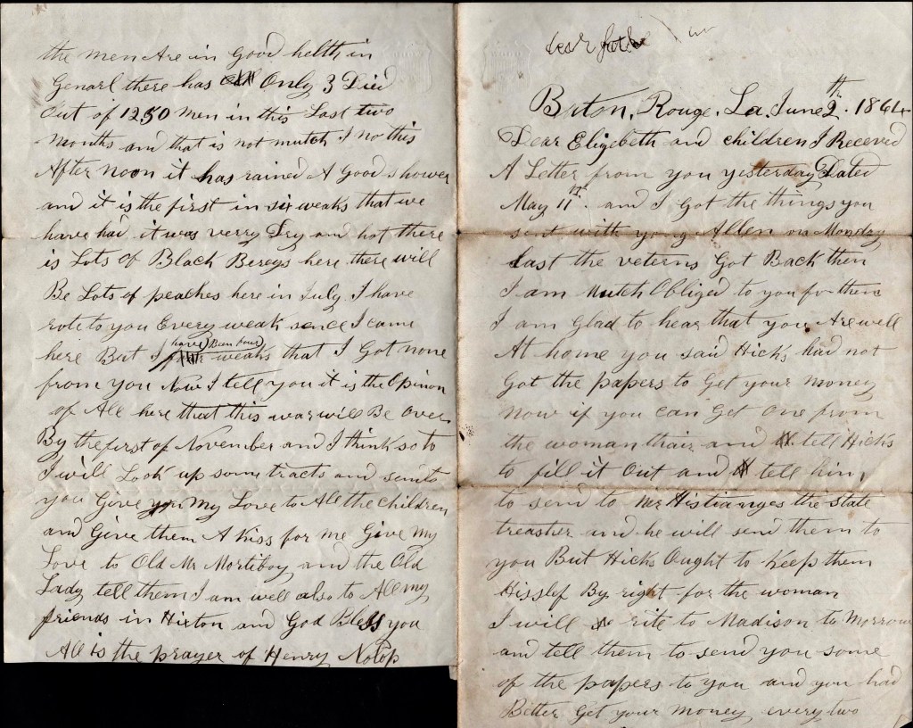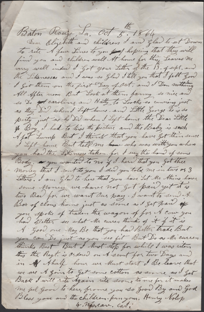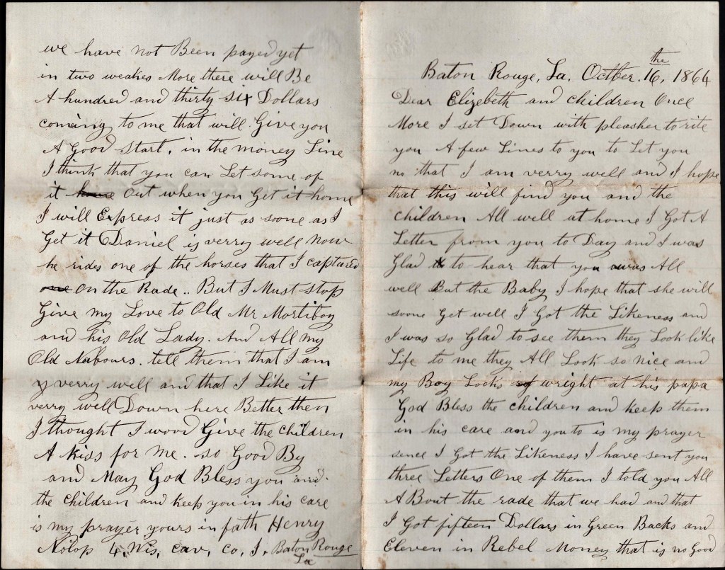 But I must close and may God bless you and the children. Kiss them for me. From your dear husband, — Henry Nolop, 4th Wisconsin Cav. Co. I. Baton Rouge, La.