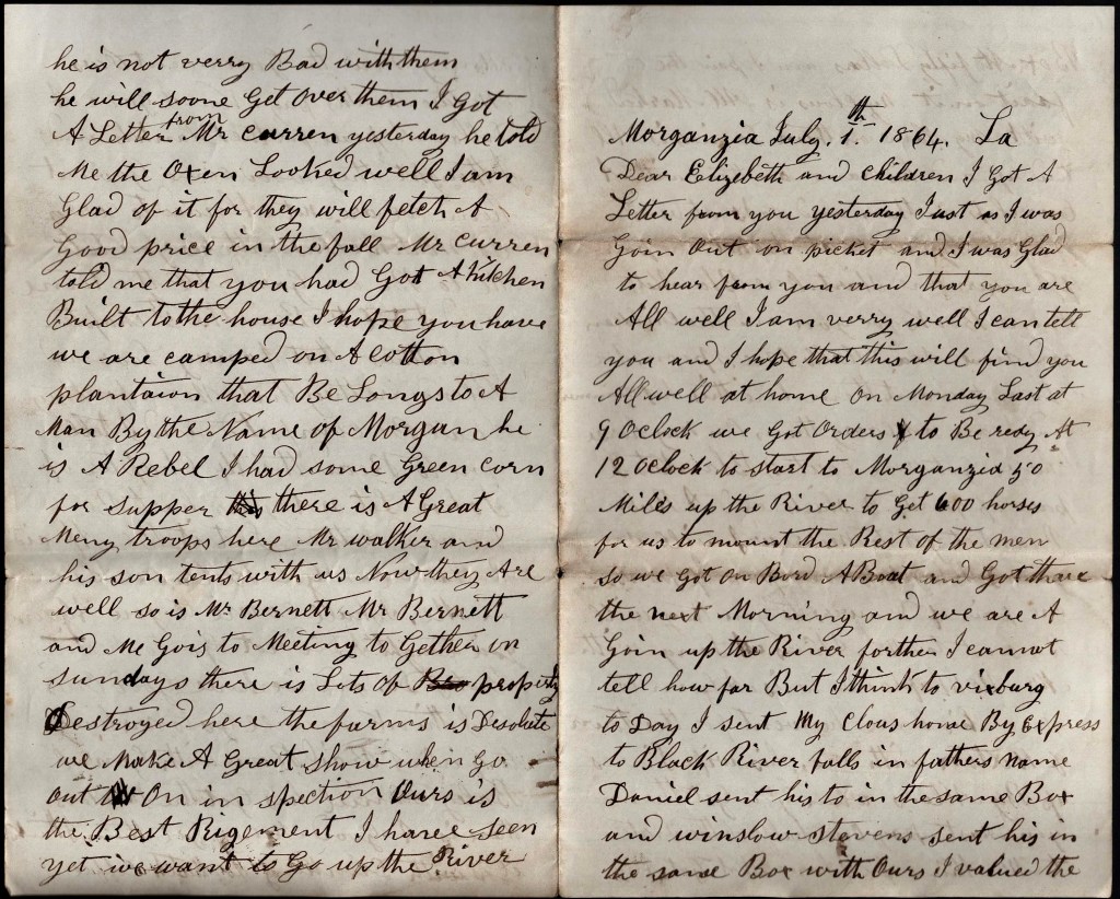 On Monday last at 9 o’clock, we got orders to be ready at 12 o’clock to start to Morganza 50 miles up the river to get 600 horses for us to mount the rest of the men so we got on board a boat and got there the next morning and we are a goin’ up the river further. I cannot tell how far but I think to Vicksburg.