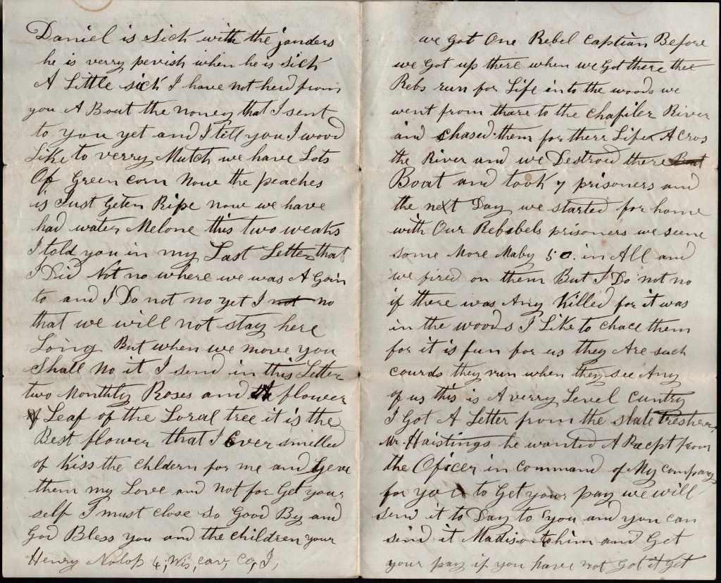I told you in my last letter that I did not know where we was a goin’ to and I do not know yet. I know that we will not stay here long but when we will move, you shall know it. I send in this letter two monthly roses and the flower leaf of the laurel tree. It is the best flower that I ever smelled. Kiss the children for me and give them my love and do not forget yourself. I must close so goodbye and God bless you and the children. Yours, — Henry Nolop, 4th Wisconsin Cavalry, Co. I.