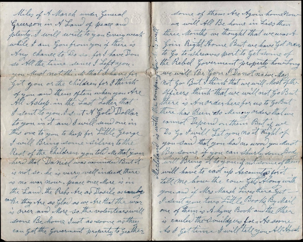 In the last letter that I sent to you, I sent a gold dollar to you in it and I will send one in this one to you to keep for little George. I will bring some silver to the rest of the children. You told me that you heard that Daniel was wounded but it is not so. He is very well indeed. There is no war now—peace once more is in the land. The rebs are as docile as can be. They are as glad as we are that the war is over and more so. The volunteers will soon be home just as soon as they get the government property together. Some of them are again home now. We will all be home in less than three months. We thought that we was a going right home but we have got orders to go to Shreveport to get some of the Rebel property. How long we will be gone, I do not know. We may not go but I think that we will. Most of the officers think that we will not go but there is an order for us to go but there has been so many orders that we cannot depend on them. But if we do go, I will let you know it right off.