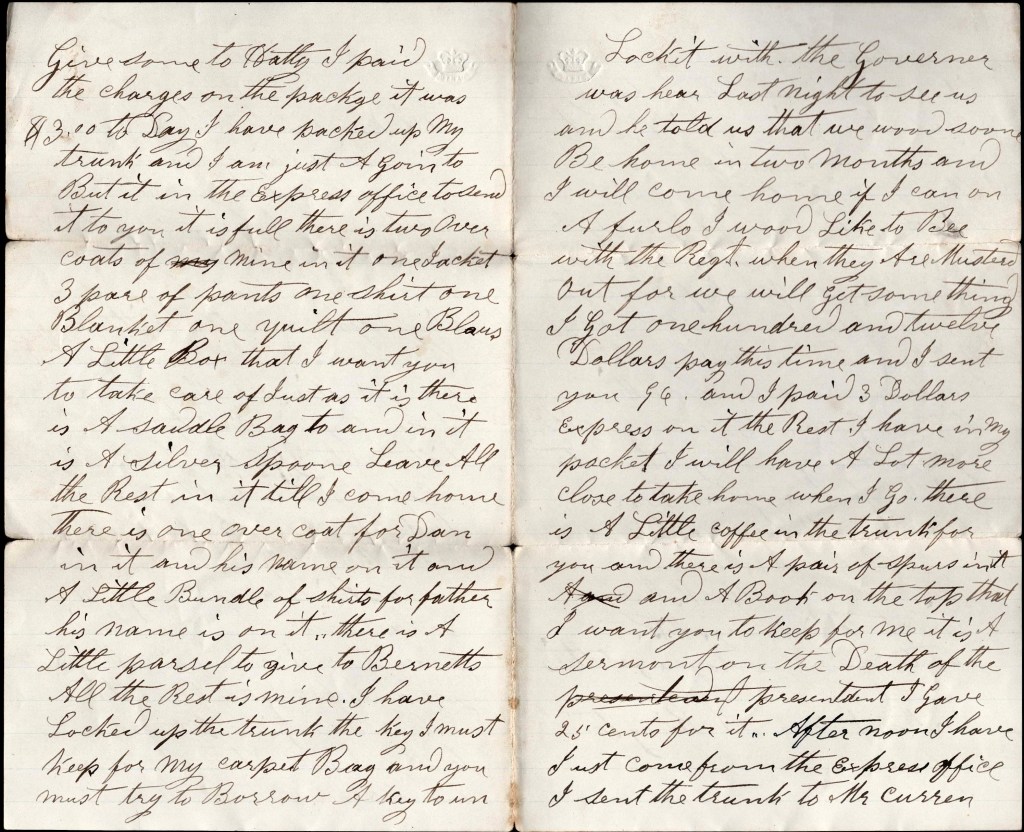 Today I have packed up my trunk and I am just a going to put it in the Express office to send it to you. It is full. There is two overcoats of mine in it, one jacket, three pair of pants, one short, one blanket, one quilt, one blouse, a little box that I want you to take care of just as it is. There is a saddle bag too and in it is a silver sppon. Leave all the rest in it till I come home. There is one overcoat for Dan in it and his name on it and a little bundle of shirts for father. His name is on it. There is a little parcel to give to Burnett’s. All the rest is mine. I have locked up the trunk. The key I must keep for my carpet bag and you must try to borrow a key to unlock it with.