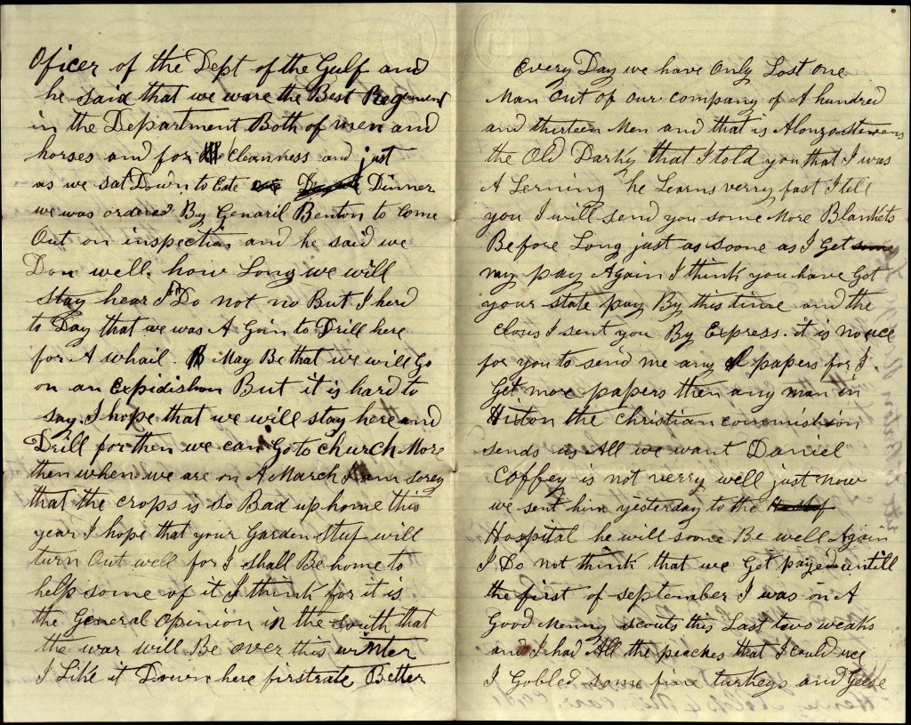 It is with pleasure that I sit down to write you a few lines to let you know that I am very well at present and I hope that this will find you all the same at home. I got a letter from you this week. It was wrote on the 3rd of May. I think that you want to know the news that we have here and what is a going on here so I will tell you. There is more camp stories than we have ever had before. No one can come into camp but the boys gather around him to hear if there is any news at all and they tell all sorts of stories about gong home. But we have to wait for our turn to come and all the troops will be home this summer—that is sure. All cannot get home right off for there is rebel property to take care of. We heard that there is an order to discharge all the men now but it has not got to us yet. We are a working under an order of May the 8th. It is said that we are to go to Texas to get some government property. That was an order before the surrender of Kirby Smith. They said that six regiments was to go and one of them was ours and they have been a fitting us up to go and the inspecting officer came from New Orleans last night. He told us that he thought that we should not go now but that we should go home soon. We was told today that we would not get any pay till we got to our state but we must wait a while and it will come all right for there is a lot of men to go home and it takes a good while to ship them all. But all will be right soon and we will be home soon I think without a doubt.