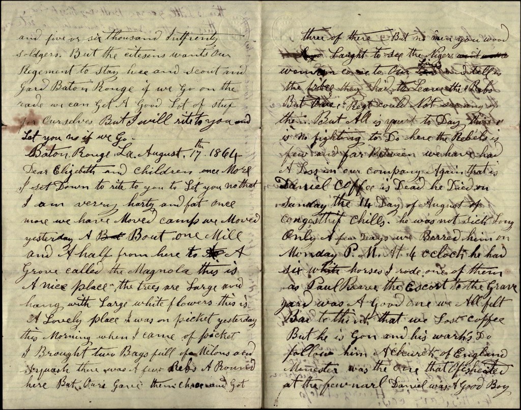 I think the war will be settled this fall and we can go home. I like it better down here every day. It has been nice and cool here for the last three days. Dan has got over his sick spell. Winslow Stevens is in the hospital at New Orleans. He seems to be poorly and Alonzo Stevens is dead. He died on the 12th of July at Baton Rouge. I think he fretted himself to death. He was very thin when he died, do they say. It is a month since I seen him, He had the typhoid fever at first but he got over that. You can send word to his wife if she has not heard of it.