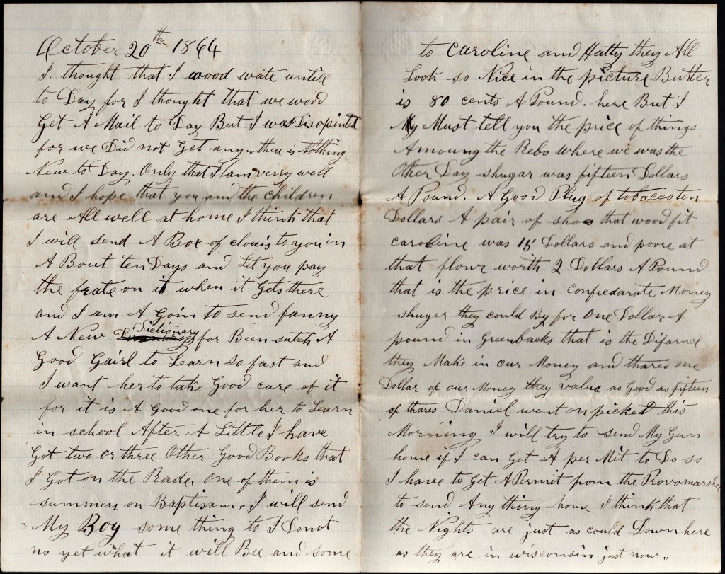 Butter is 80 cents a pound here but I must tell you the price of things among the Rebs where we was the other day. Sugar was fifteen dollars a pound. A good plug of tobacco ten dollars. A pair of shoes that would fit Caroline was 15 dollars and poor at that. Flour worth two dollars a pound. That is the price in Confederate money. Sugar they could buy for one dollar a pound in green backs—that is the difference they make in our money and there’s one dollar of our money they value as good as fifteen of theirs.