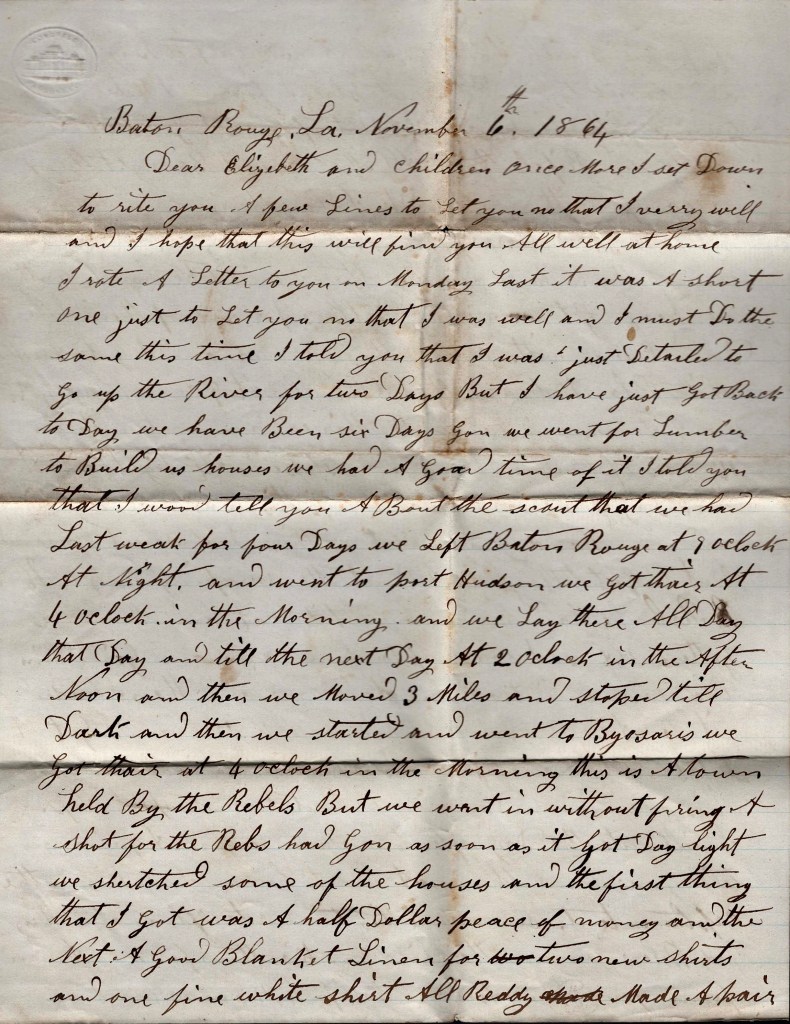 I told you that I would tell you about the scout that we had last week for four days. We left Baton Rouge at 9 o’clock at night and went to Port Hudson. We got there at 4 o’clock in the morning and lay there all day that day and till the next day at 2 o’clock in the afternoon and then we moved three miles and stopped till dark. And then we started and went to Bayou Sarah. We got there at 4 o’clock in the morning. This is a town held by the rebels but we went in without firing a shot for the rebs had gone. As soon as it got daylight, we searched some of the houses and the first thing that I got was a half dollar piece of money and the next a good blanket, linen for two new shirts, and one fine white shirt all ready made. A pair of pants, two silk handkerchiefs, and a new carpet bag and a necktie. And the next place I found a rebel gunsmith shop and a lot of guns. I got two splendid rifles there, almost new. I brought them to camp with me. I wish I had them home. I would not take 50 dollars for them. I am a going to sell one of them here and the other I will take home with me. I can get sixteen dollars for one of them here.