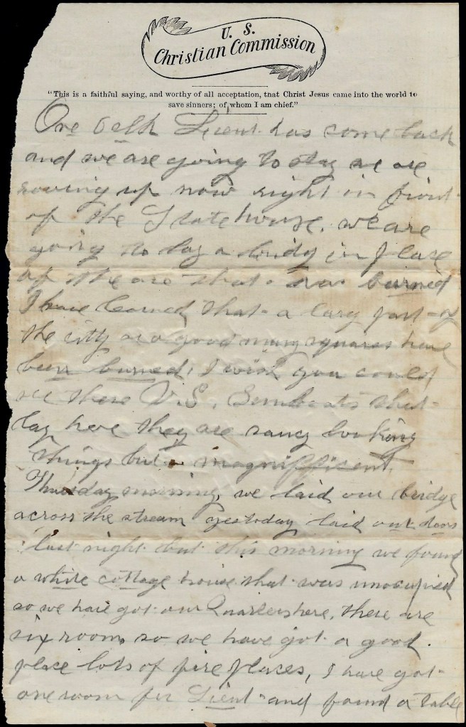 We are within one mile of Petersburg and in the rear of Fort Petersburg. We can see the steeples at Petersburg and the buildings that they have got our prisoners in. John, you ought to see the guns that they have got mounted on this fort. They look huge, I tell you. They say they could throw a shell into Petersburg with them. I don’t doubt it for they look as though they was capable of doing. The pickets are a firing all the while at each other. I could hear them plain enough when I was at the Point and most too plain here. I would rather [ ] to the rear if they would let me,