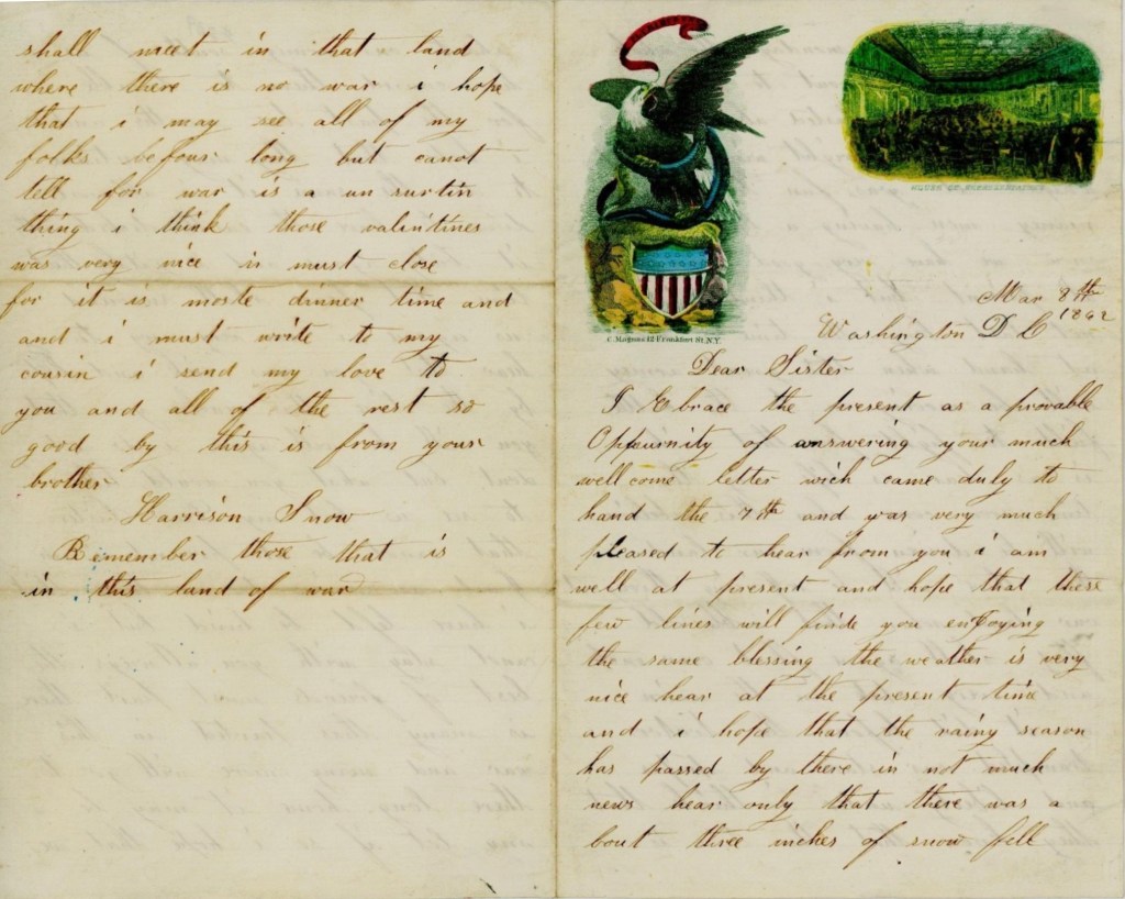 We ate our breakfast, stayed there until eleven, and then we fell in and marched to where we are now. I tell you, our knapsacks was pretty heavy before we got [here]. Some of the boys threw away one of their blankets, they was so wet and heavy, but I got through with mine and stood it first rate. We got here about noon. There was winter huts built that some soldiers vacated but all mud and snow—pretty shabby for they was built in a hurry. We put our tent cloth on [one] and cleaned them out as well as we could. We had to be pretty thick for their wasn’t huts enough. There was twelve of us together—just as thick as we could stand up. I never felt thecold so much as I did that night. It seemed as though we should freeze. The wind blew hard and froze hard as a rock. It don’t look much like the Sunny South they tel about, and our old tent you could throw your hat through it anywhere.