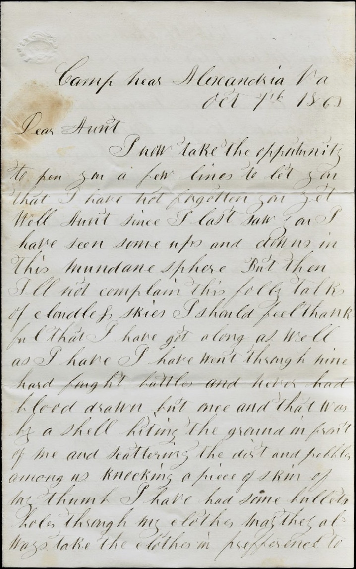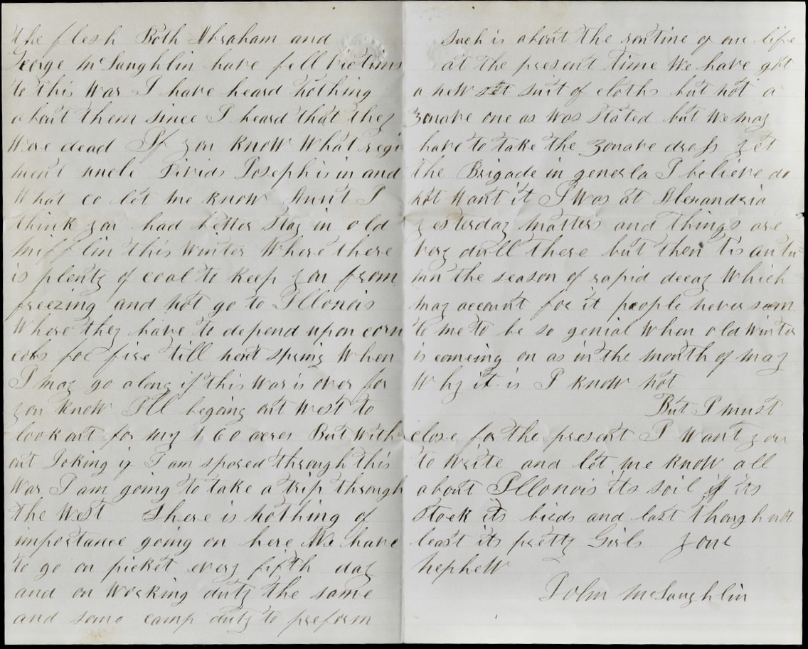 I now take the opportunity to pen you a few lines to let you [know] that I have not forgotten you yet. Well, Aunt, since I last saw you I have seen some ups and downs in this mundane sphere but then I’ll not complain. This folly talks of cloudless skies. I should feel thankful that I have got along as well as I have. I have. I have went through nine hard fought battles and never had blood drawn but once and that was by a shell hitting the ground in front of me and scattering the dust and pebbles among us, knocking a piece of skin off my thumb. I have had some bullets through my clothes. May they always take the clothes in preference to the flesh. Both Abraham and George McLaughlin 1 have fell victim in this war. I have heard nothing about them since I heard that they was dead. If you knew what regiment Uncle David’s Joseph is in, and what company, let me know.