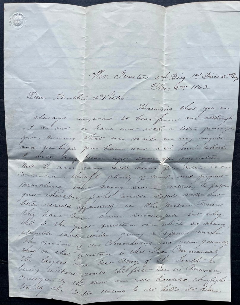 But we are confident that we have right on our side. Hence our confidence and determination. We all think that our General (Meade) will do wonders. He has proven himself to be a man for. the times. Since the organization of the Army of the Potomac, Gen. McClellan has been identified with it. As a Corps Commander, he [Meade] had no equals. And as for Gen. McClellan, I am done with him as far as Politics is concerned. The letter he wrote some time before the Pennsylvania Election will satisfy all men on the subject of right and wrong. He said he agreed with Mr. Woodward in every particular. Well now, Mr. Woodward is undoubtedly a Copperhead and the same conclusion we may make about our once favorite general. This is a hard pull for me, you know. The love I had for him as a man, not saying anything about him as a general for as the latter all the generals in this army think there is none better. His skill was unequal, we all firmly believe. But he was a young man and too much praise was lavished on him. This will ruin anyone and especially a young man. This is the hope we have of Gen. Meade. He is a man of 60, or nearly, very thoughtful and determined.