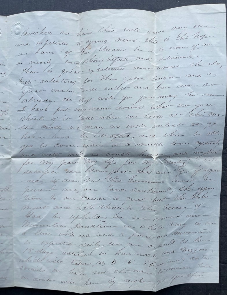There is great excitement now about the old regiments enlisting for three years longer and as great many will enlist and have done so already, our regiment will go, you may be sure. I have put my name down. What do you think of it? Well, when we look at the matter cooly, we may as well enlist as go home and be drafted and then be obligated to come again in a much lower capacity and with not so much honor and respect. For my part, “My life for my country.” I will sacrifice ease comfort and [ ] life if required. It’s dear but this government must be preserved and ourlaws sustained. The opposition to our cause is great but the right must and will through the blessing of God be upheld.