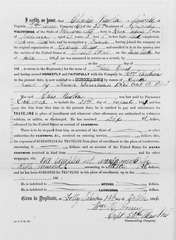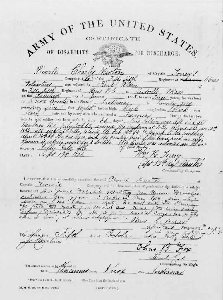 The following letter was written by 21 year-old Pvt. Charles Newton, a barely literate Black soldier in Co. C, 55th Massachusetts Infantry. According to muster rolls, Charles was a 5′ 8″ tall farmer from Knox county, Indiana, when he enlisted at Readville, Massachusetts on 20 June 1863. He was sick at left at Newborn, North Carolina, when the regiment left on 30 July 1863. He was on duty at Portsmouth and Norfolk, Virginia, in the fall of 1863, but was sick at Folly Island near Charleston in mid-February 1864. He was discharged for physical disability on 5 October 1864 but being unable to move due to his chronic diarrhea condition, he died on Folly Island on 13 October 1864.
